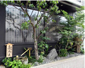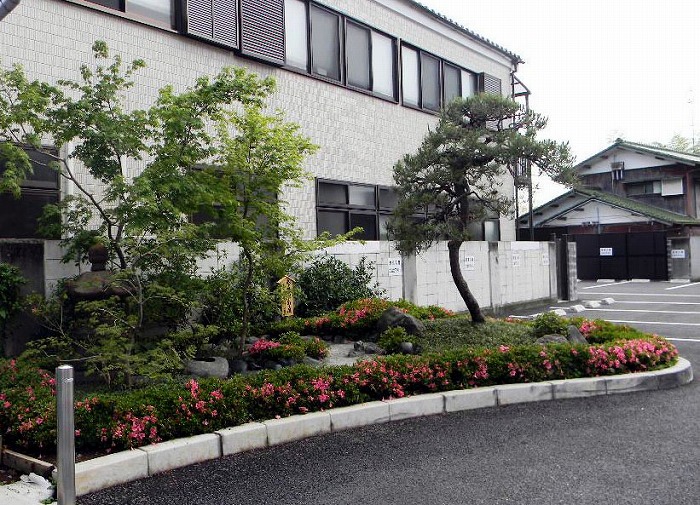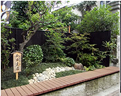 道路脇に歩いている人が憩いの休憩の場所。樹木の手入は、自然らしく、庭園は少さいが安 らぎの庭として、構成した。