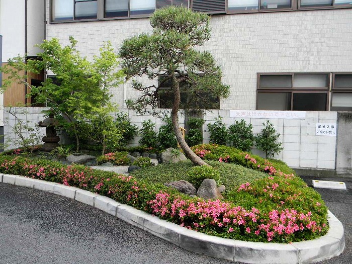 道路脇に造られたグリ-ンベルトにサツキ、玉龍、石、花による見通のよい、低木を使用す ることにより周囲の安全を図る。(左側2点)