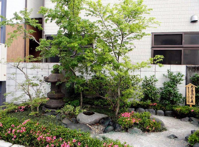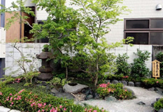 左側には、灯篭、手水鉢、植裁は、紅葉を配置し、新緑、紅葉を見るために配置し、春には、サツキを中心に変化を見、松の木1本で空間を出した。