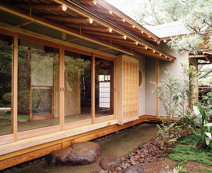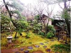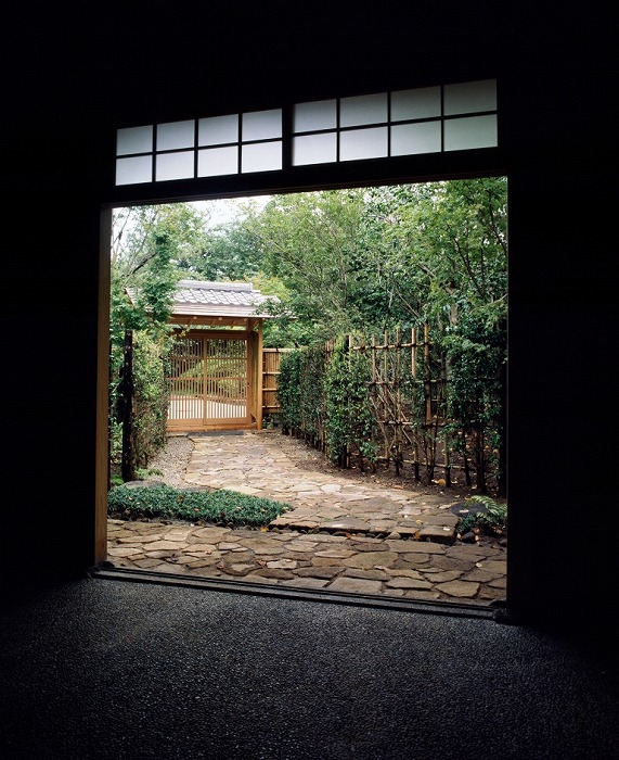 | 正門から茶室を見た姿。園路・石張りの側が苔によって落ち着きのある庭園空間となっている。 |