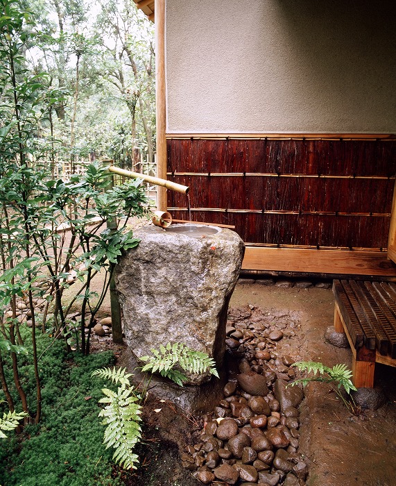 | 広間脇に造られた立手水鉢、下草と雨落の姿が庭としての柔らかさが常に見入られる。 |
