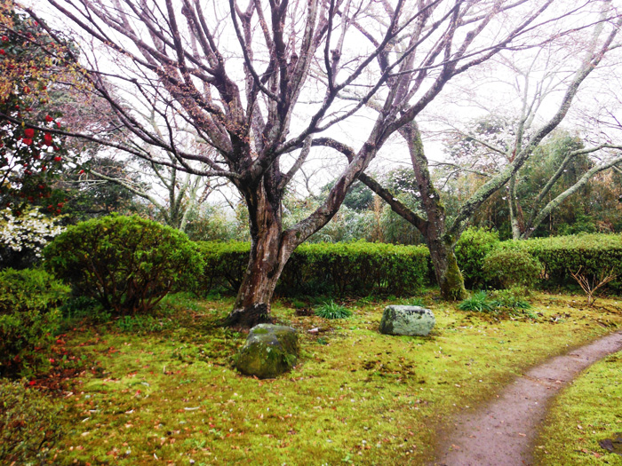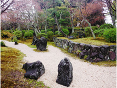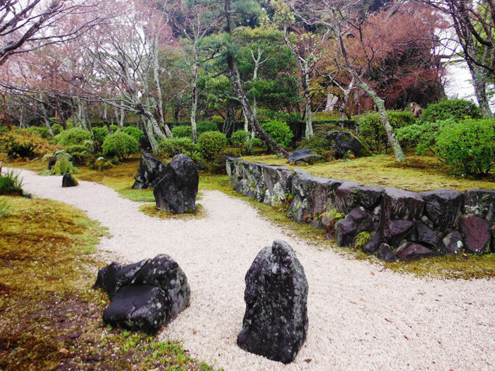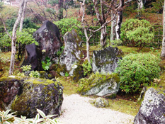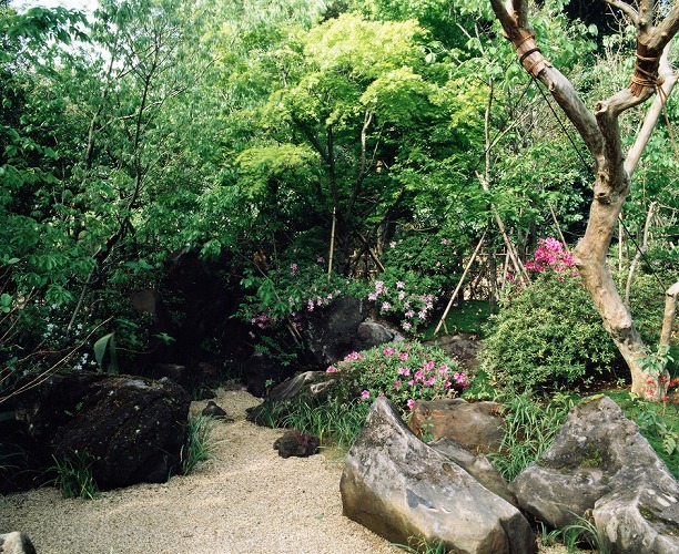 | 枯山水の石組・石積などを行ってはいるが、その堅さをなじめるように苔・樹木によって景観を見出している。 | |