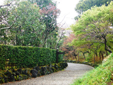 | 左側より | 裏口の門・周辺・園路は飛石・景石は少なく、桜・紅葉・松などの樹木・低木・熊笹・躑躅などによって構成を計る。 |