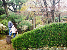 | 裏門に向いう観光客。人の動きがある事により、庭に嗜みを感じる。垣根を内径にする事により、風景の立ち木に対しての動きを見出す。 | |