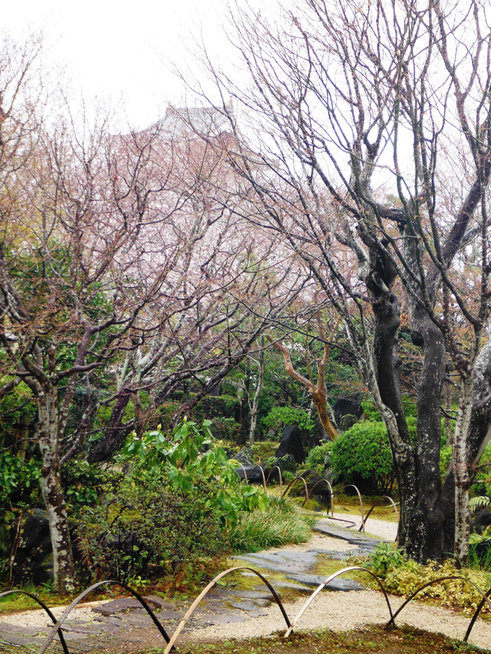 | 裏側、槙垣を内径とし、紅葉・石積の先には、桜。躑躅などにより春の暖かさを感じられる風景である。 |