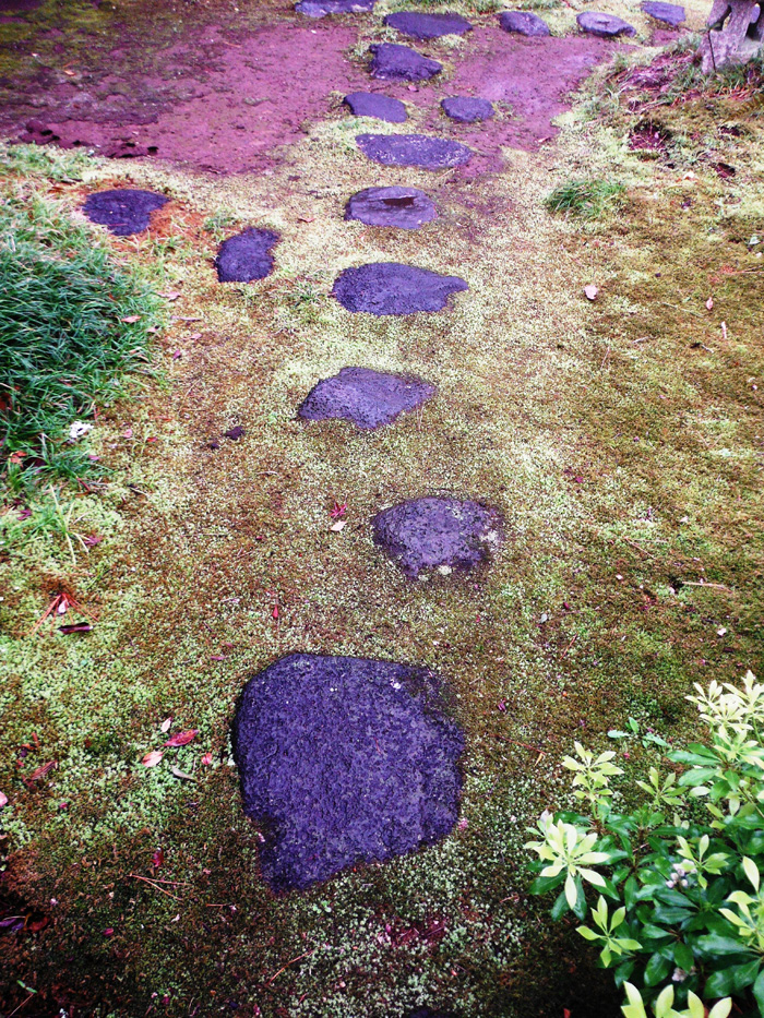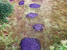 | 茶庭に据え付けられた飛石と苔の世界。 |