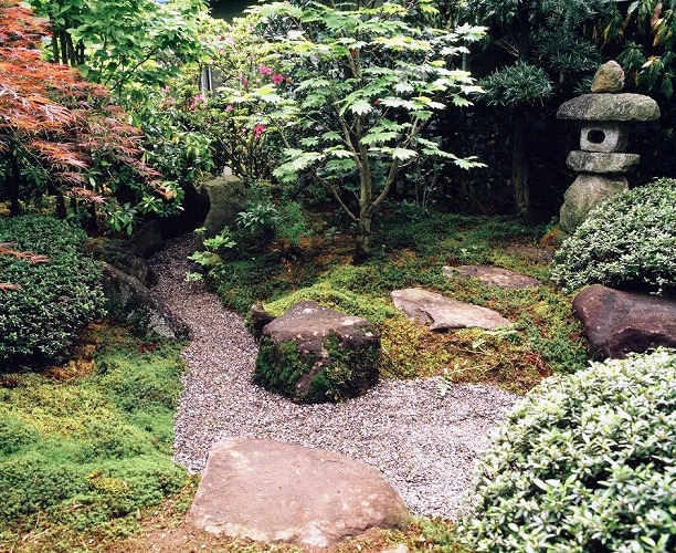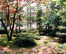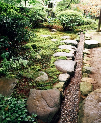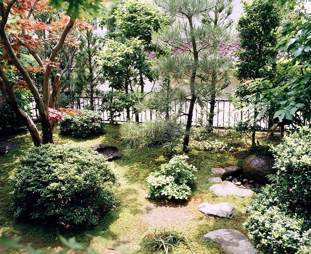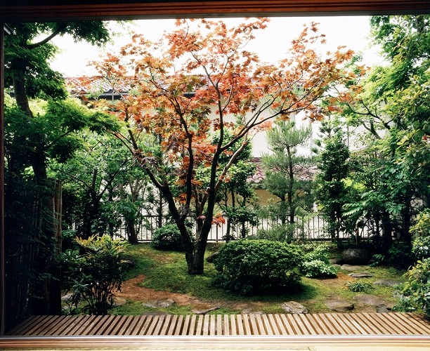 庭の中心は、ノムラ紅葉による緑に対しての明るさを出す低い枝は、切り取り工事により狭いお庭に空間を出してある。庭に対しての奥深さは、さっき玉によって、庭に締まりを出し右側奥には、そっと置かれた手水鉢か小さなポイントになる部屋から見ている正面写真です。庭の中の飛石を置き小さな動線を見せている。樹木の枝は、小ずかしの剪定で自然の姿を映しています。