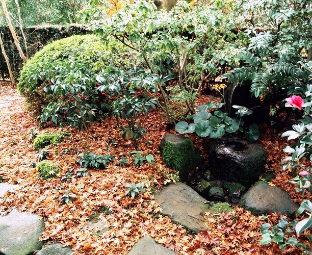 手水鉢を中心に上部には、紅葉が植えてある。床には、落葉の葉をつきつめることにより「秋深」さを楽しんで・・と思います。紅葉の葉のおき味から万両が小さく優しく見えます。左側には、小さな石に「苔」が付き落ち着きさを表しております。秋には、右側手前に「寒椿」を植え、花一輪を大事にしている。5月末には「ツツジ」の花、6月中日までは「サツキ」の花で'"楽しむ"。手水鉢の手本は、ツワブキの黄色の花が数本咲いている。いずれも、自然体の庭造りをもとめております。