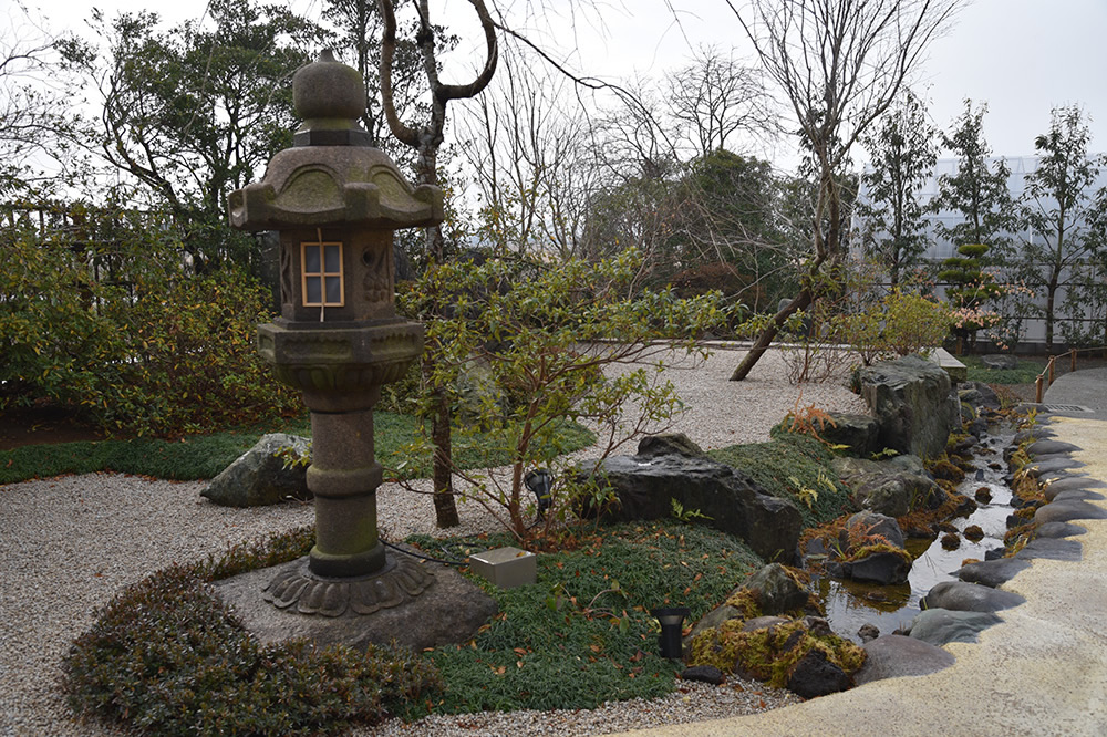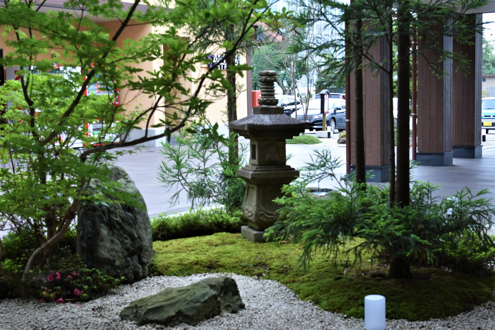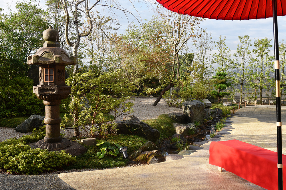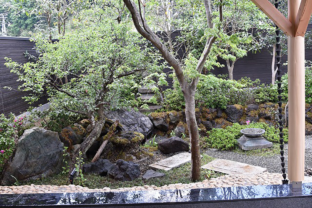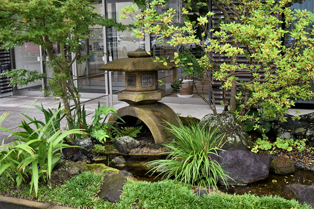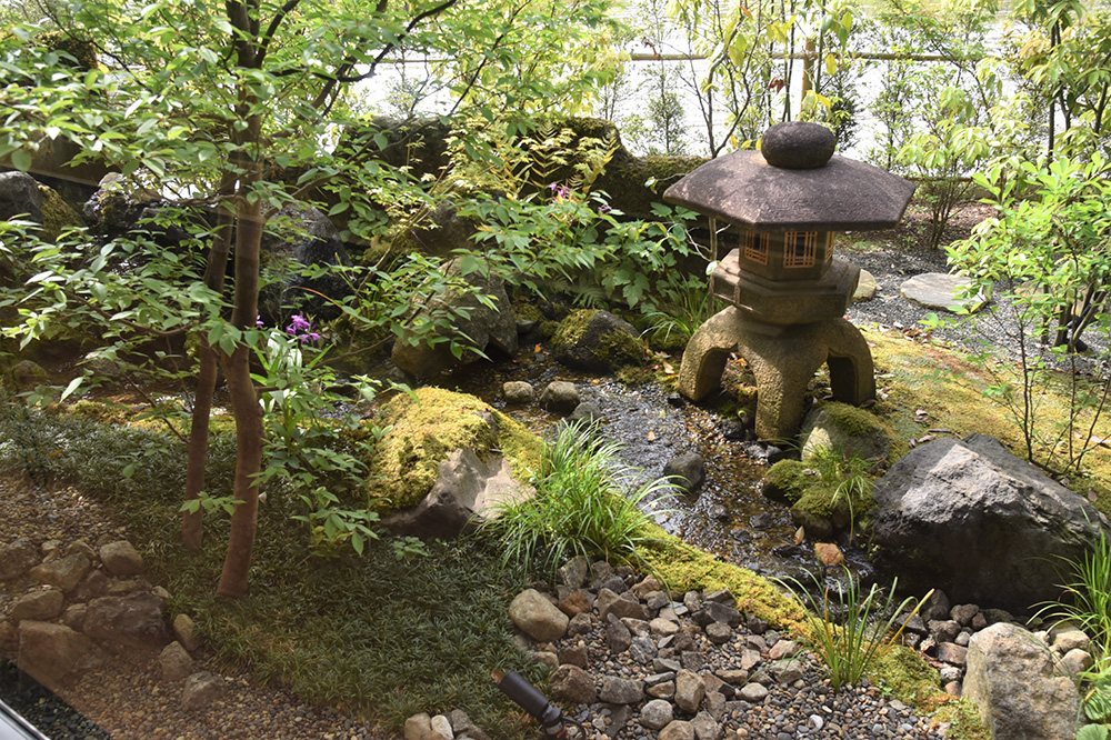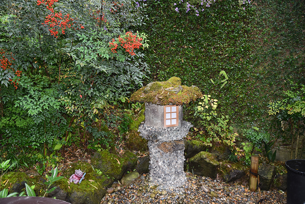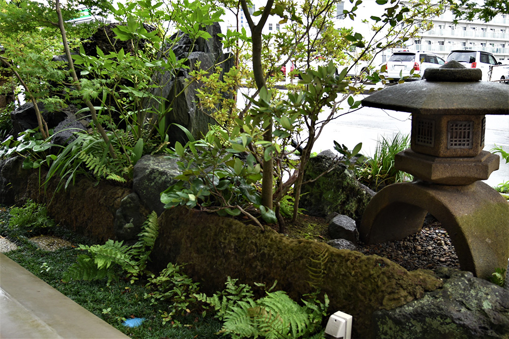 ⑦ レストラン外側には、苔、庭石、小砂利、灯篭他により日本庭園の世界をより深めています。