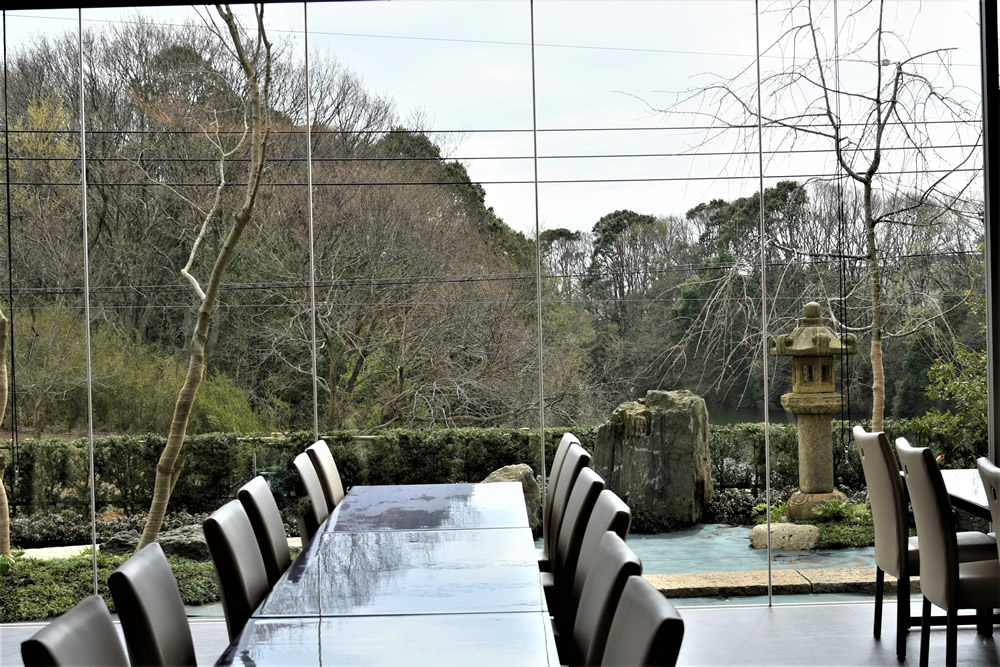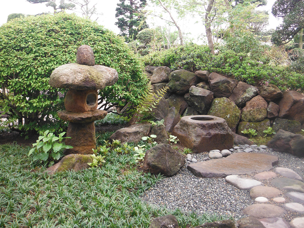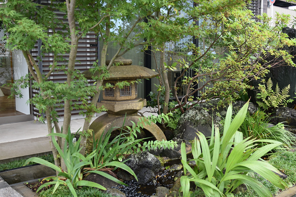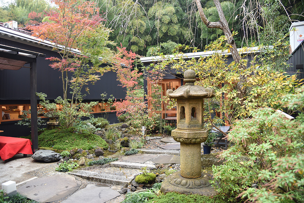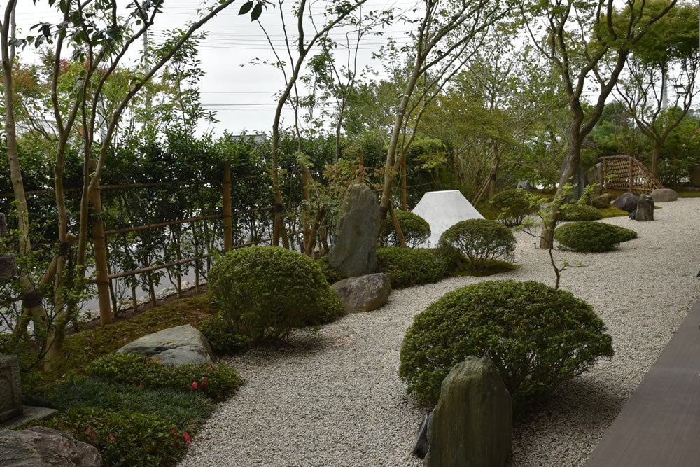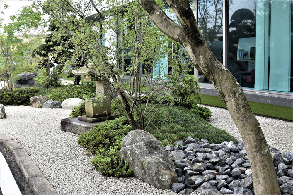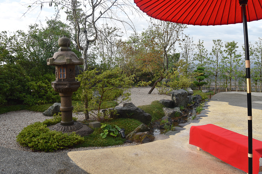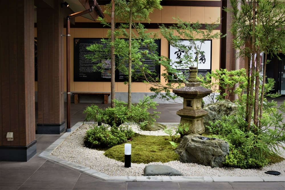 ⑦ レストラン外側には、苔、庭石、小砂利、灯篭他により日本庭園の世界をより深めています。
