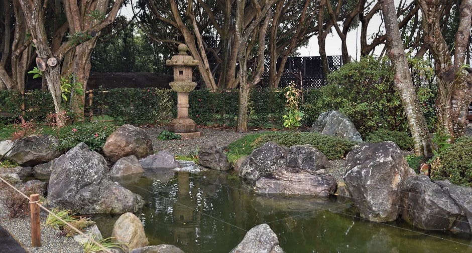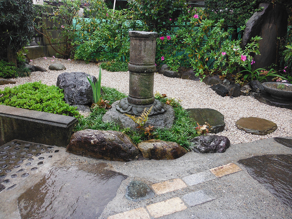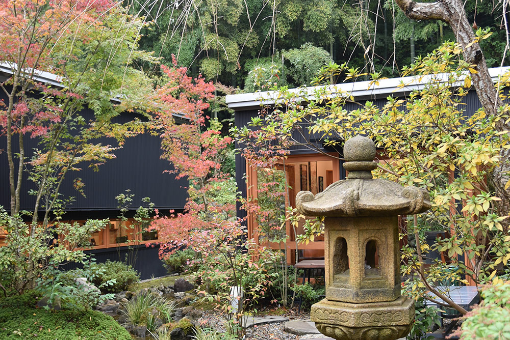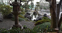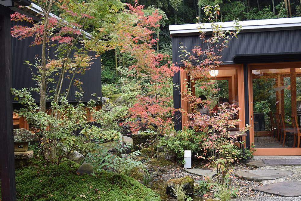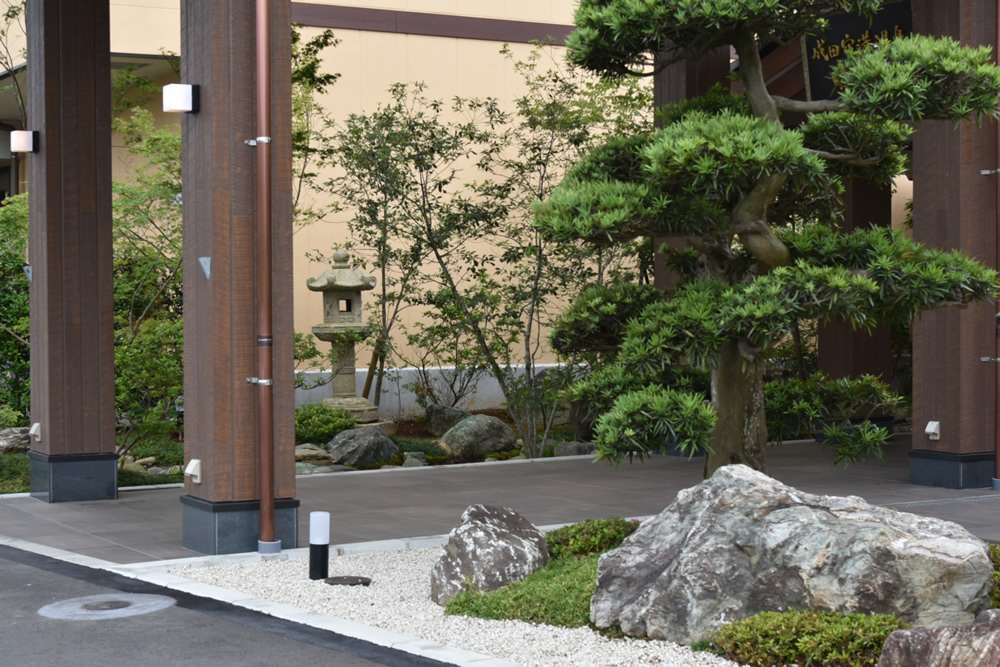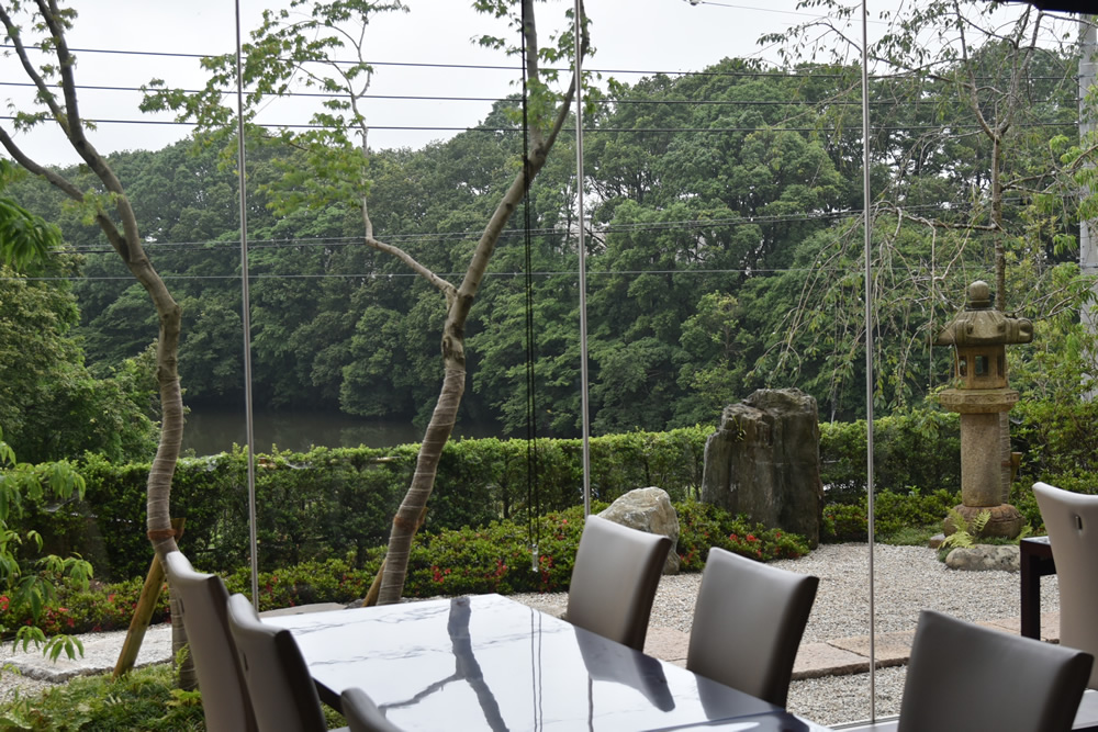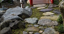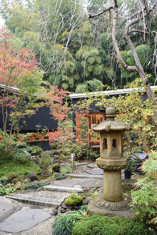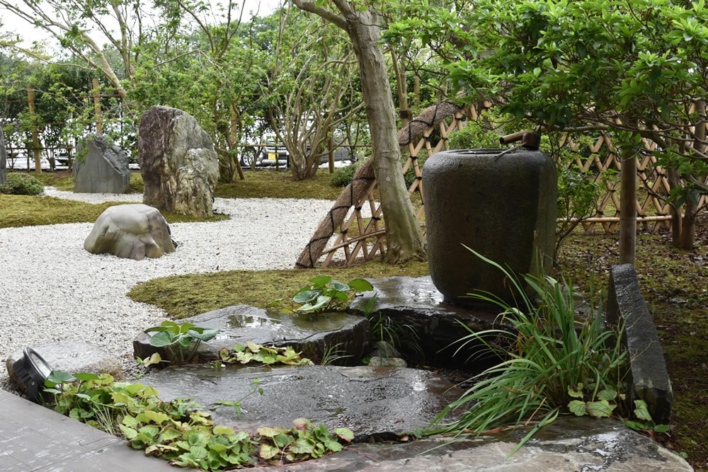 ⑦ レストラン外側には、苔、庭石、小砂利、灯篭他により日本庭園の世界をより深めています。