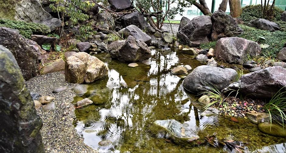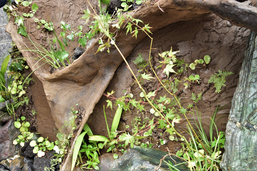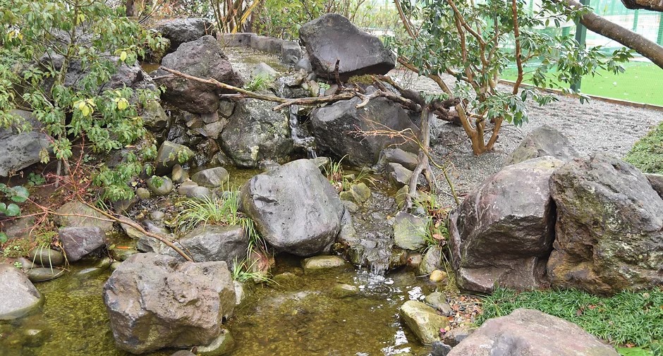 滝壺の流れを形取り、自然の景観又マンホ-ル等などを利用して(楽しみ)に金魚などを数匹泳がせ見る人に一時の楽しさの一つです。
