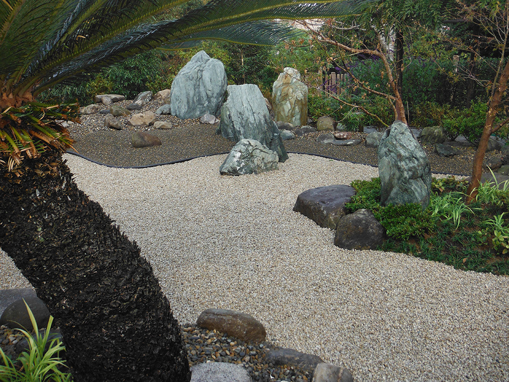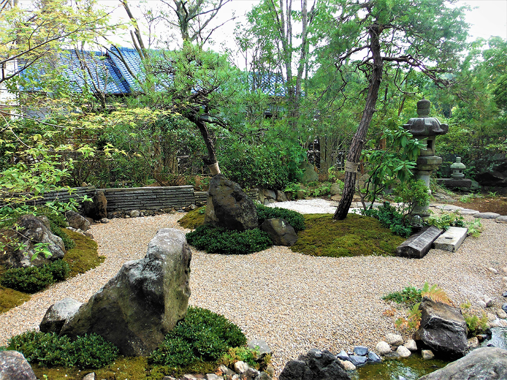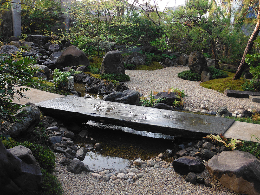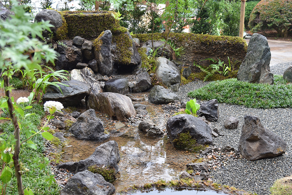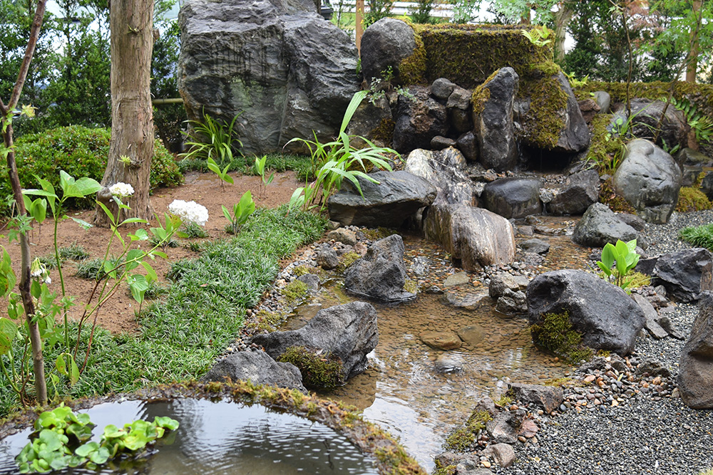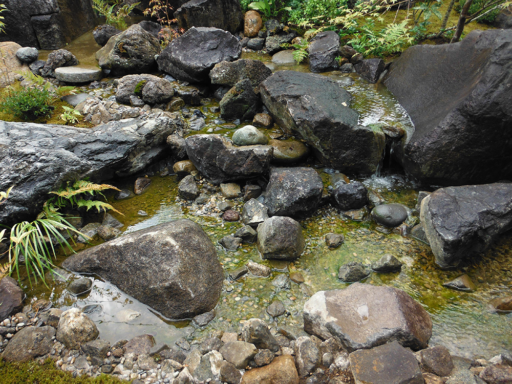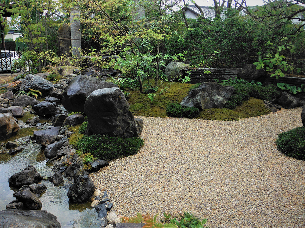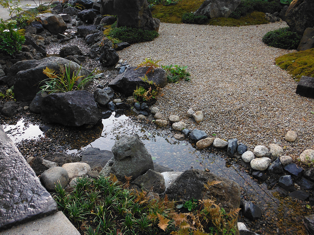 日本庭園の本来の姿。山部、水流、砂利浜により池の姿を表現いたしました。