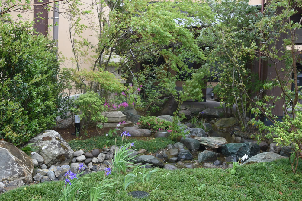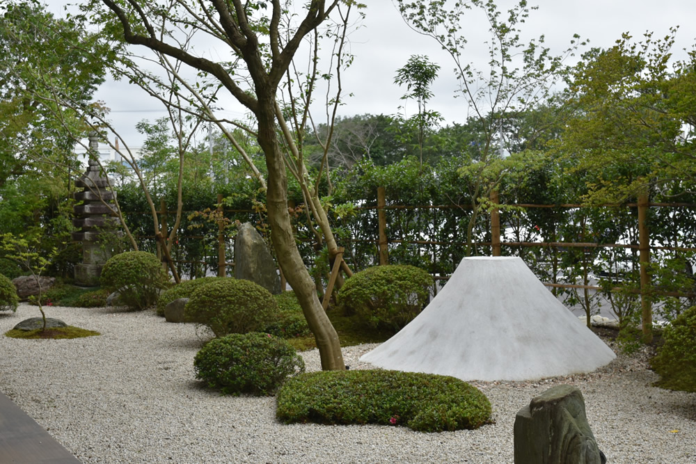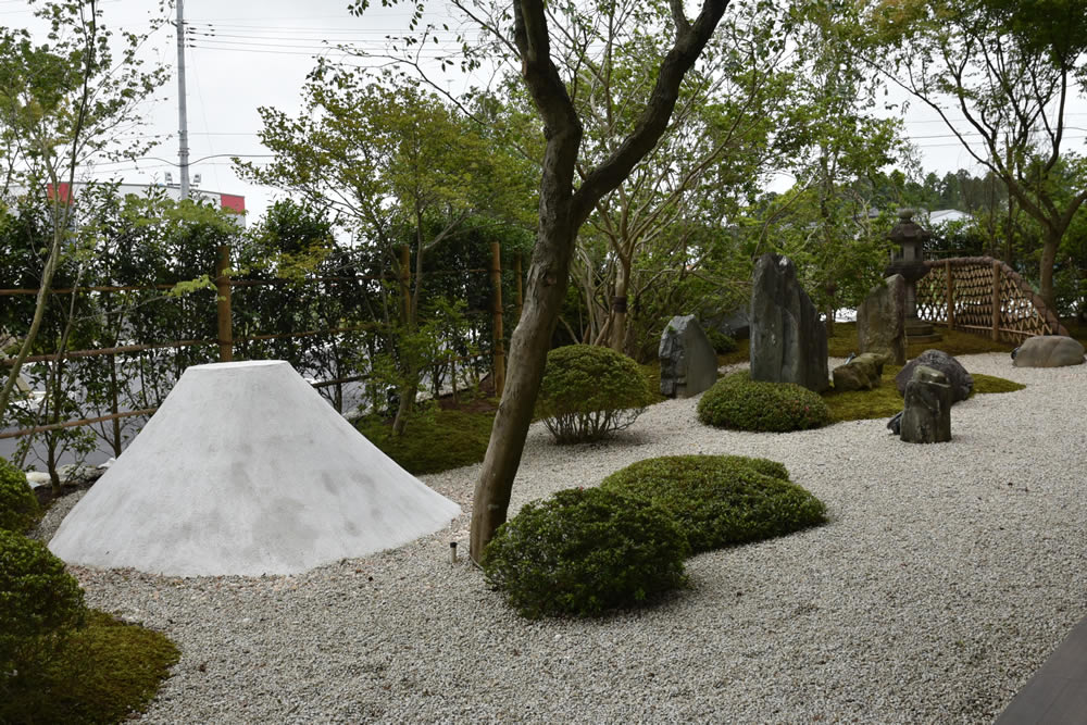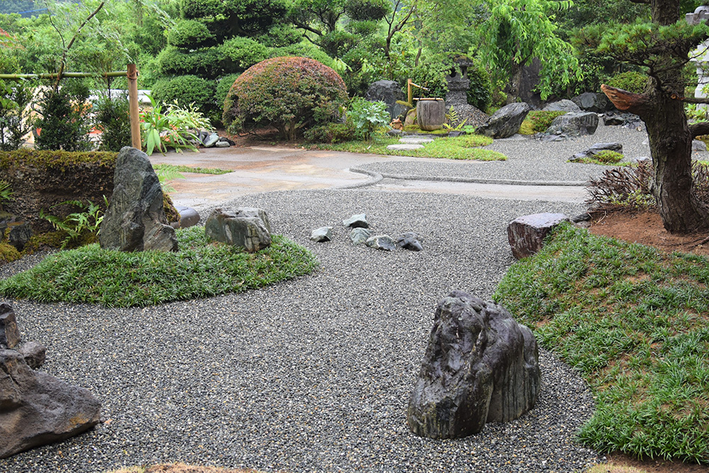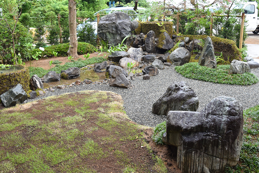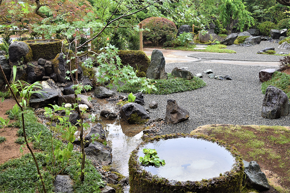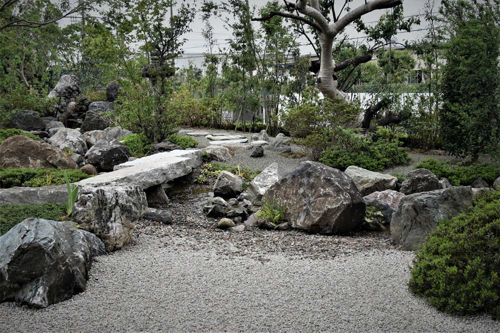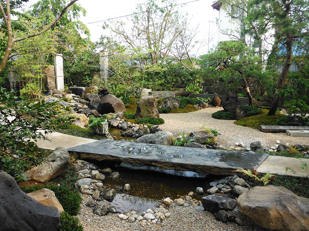 日本庭園の本来の姿。山部、水流、砂利浜により池の姿を表現いたしました。
