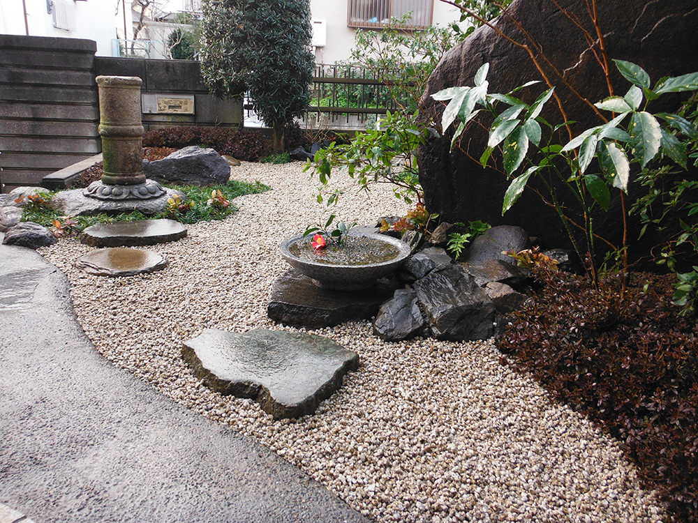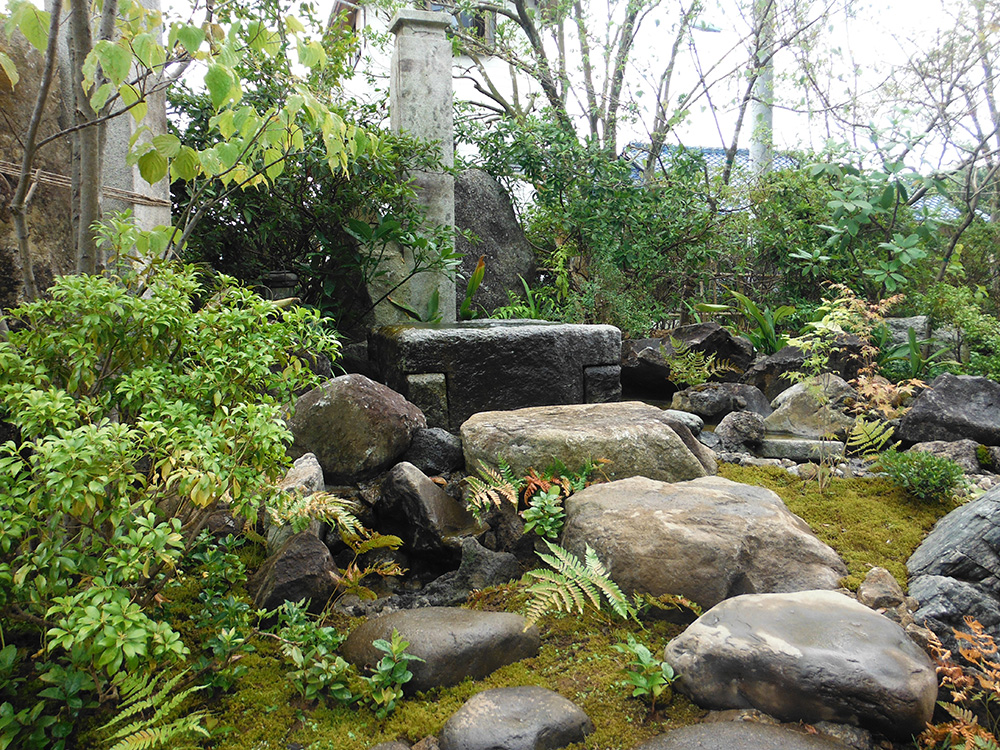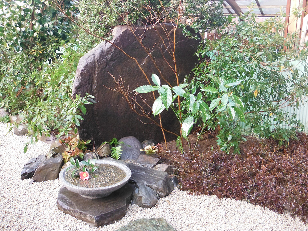 玄関前に造られている。水鉢は現状に合わせてコンクリ-トで固め小石などを組み合わせ、苔を張る事によって造られた鉢、庭の中心部を建石があるがこれにより庭に高低差を付けました。