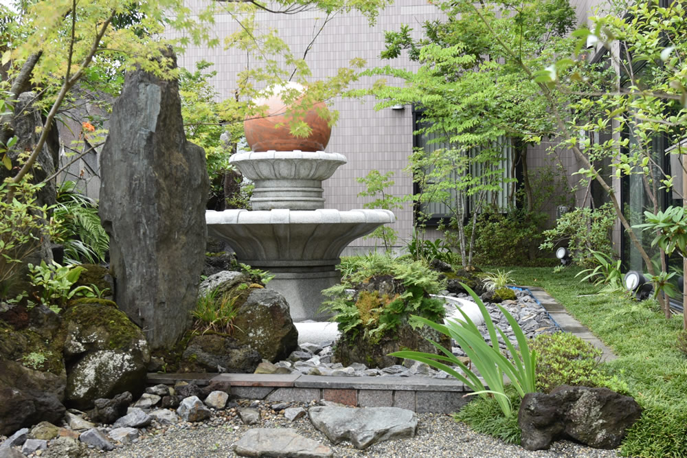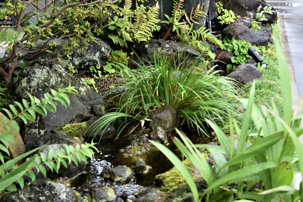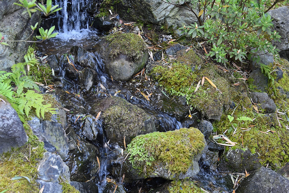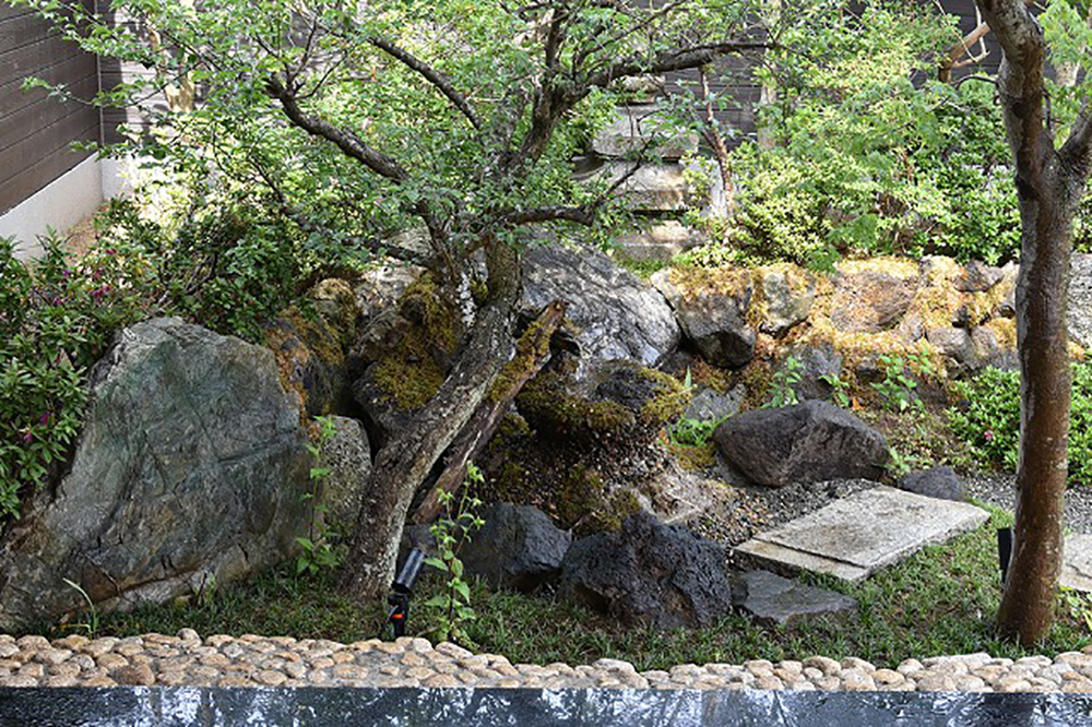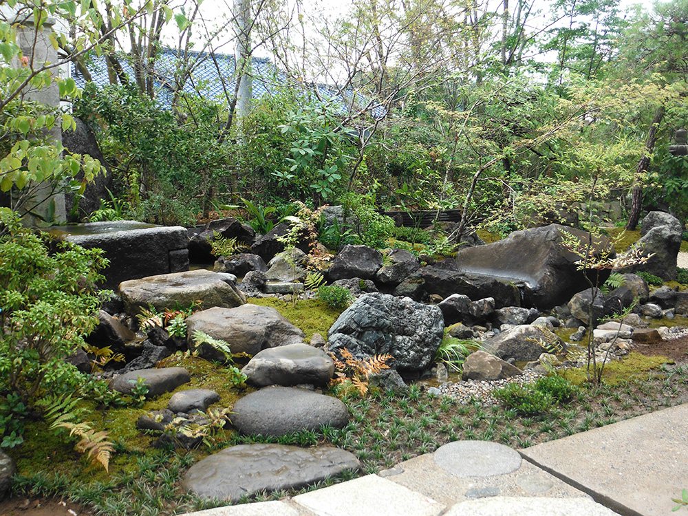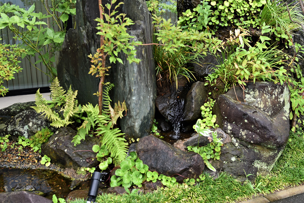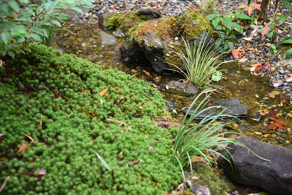 循環ポンプを取り入れて水を流し地被及び下草により流線、明暗など少々芸術的な美の世界をつくりました。