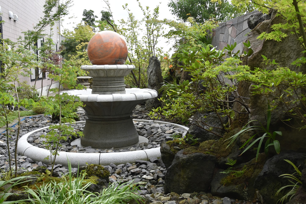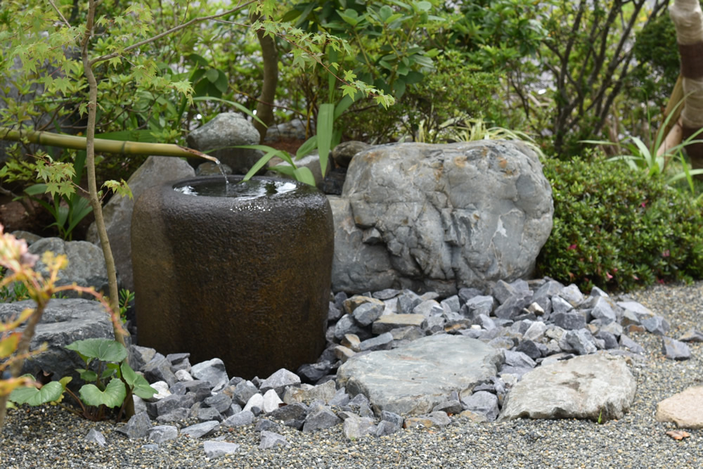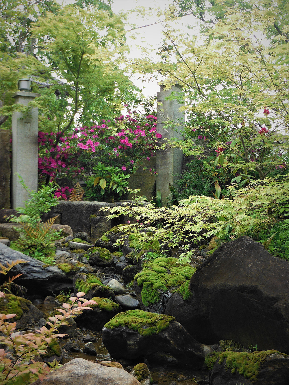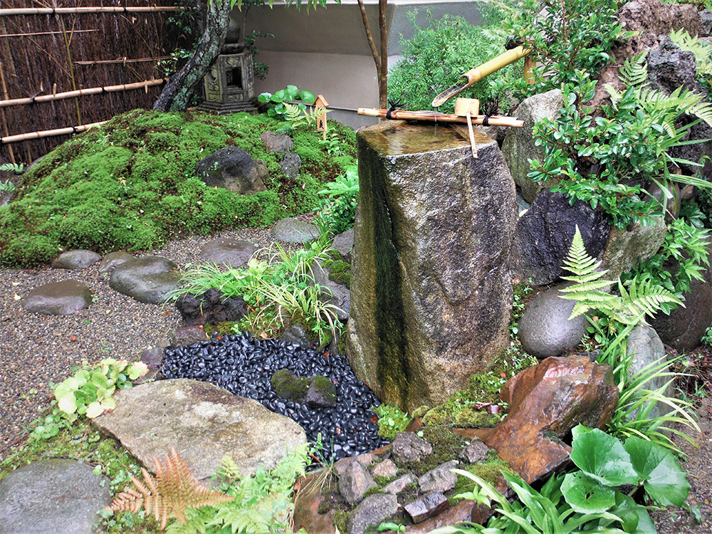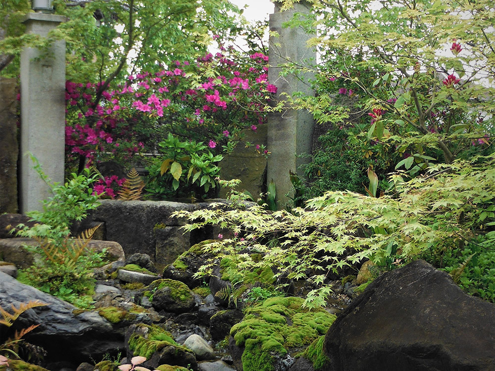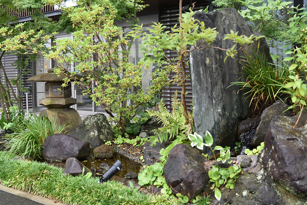 循環ポンプを取り入れて水を流し地被及び下草により流線、明暗など少々芸術的な美の世界をつくりました。