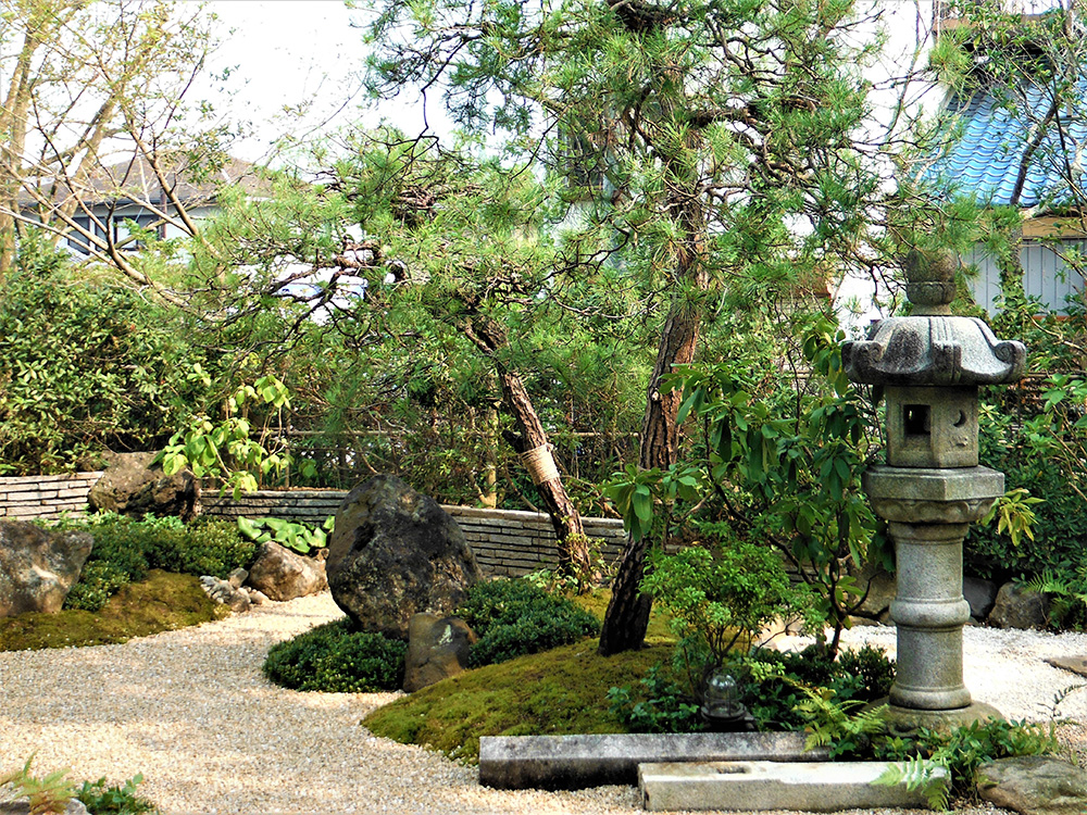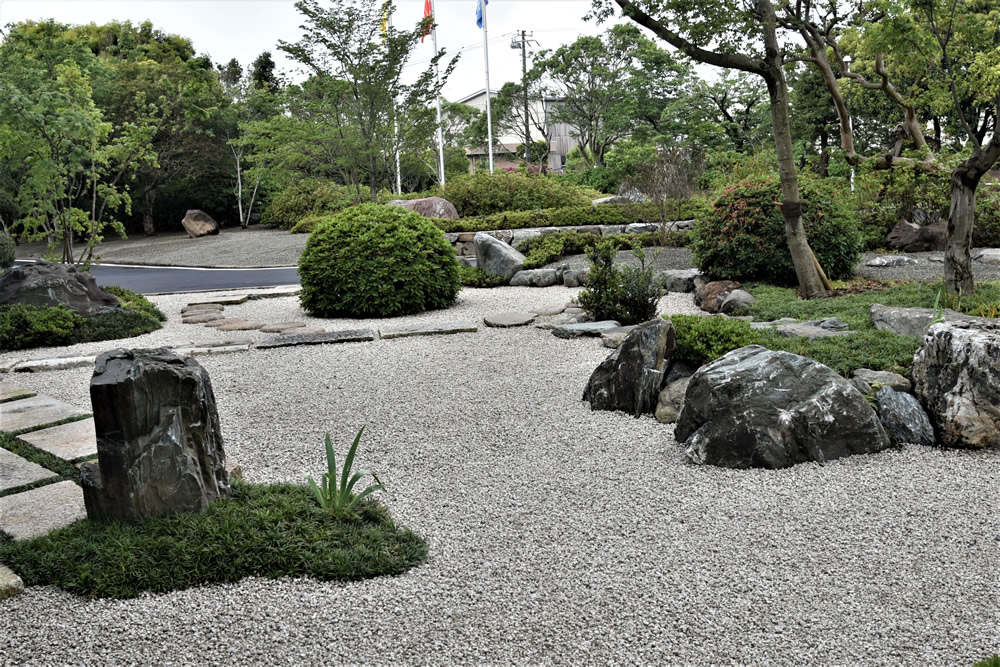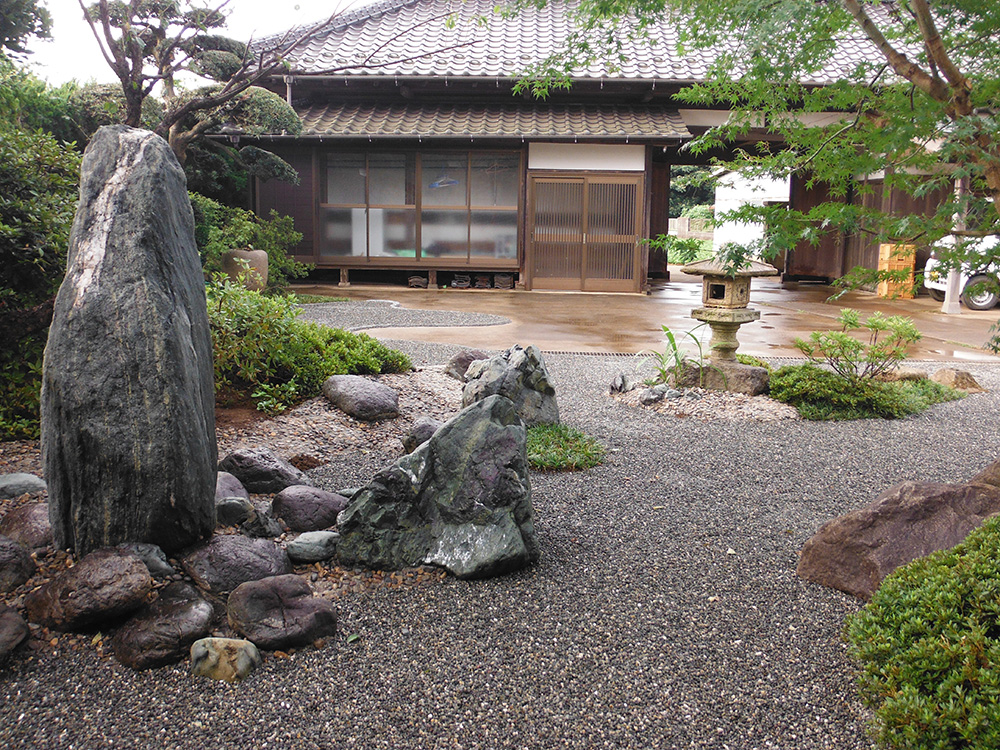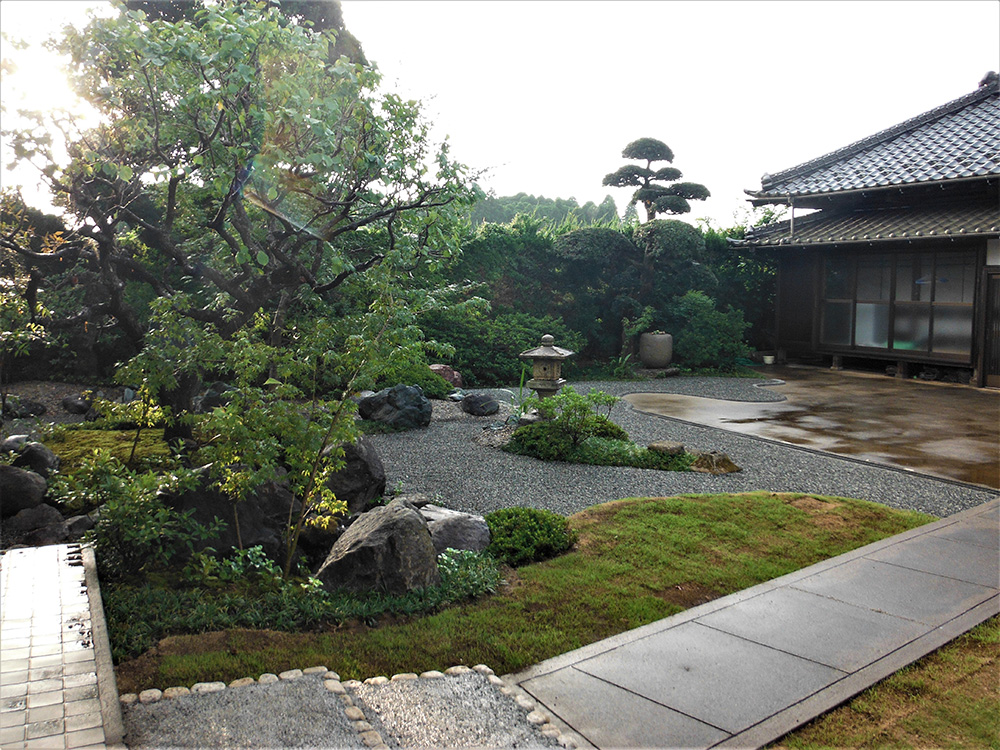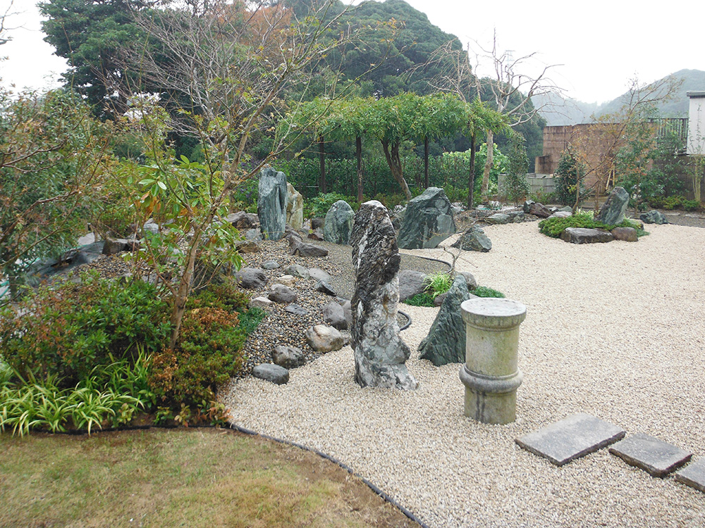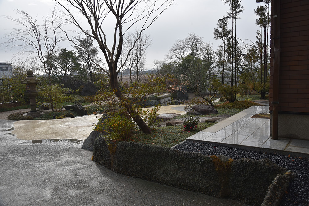 玄関左側に対して龍部は2石の紫石などによって龍の姿を見えるよう配置。背景に石を右流れに組、右側に向かって石組みにしました。植木と石組を空間に取り入れて一コマ、一コマを組み込み、灯篭などを配置し、来客者に歓迎の挨拶を踏まえて作品といたしました。