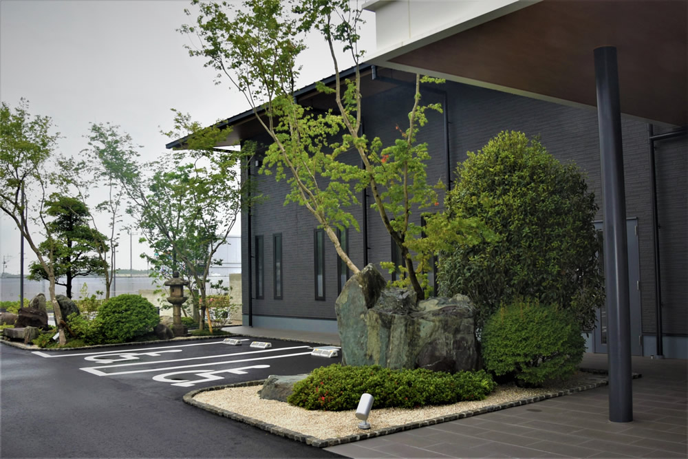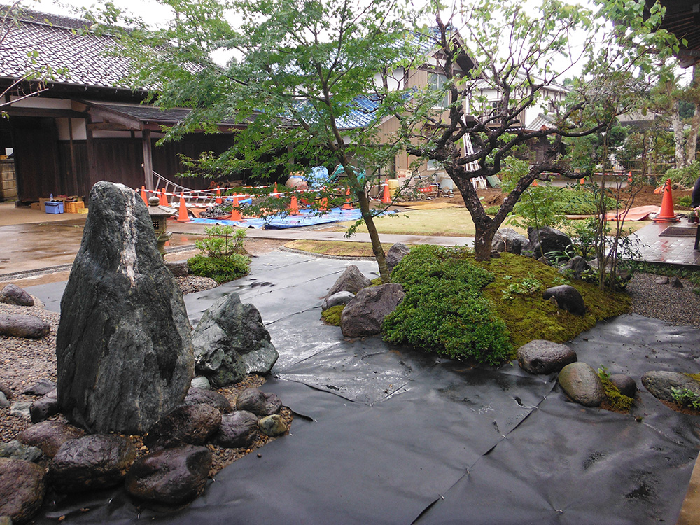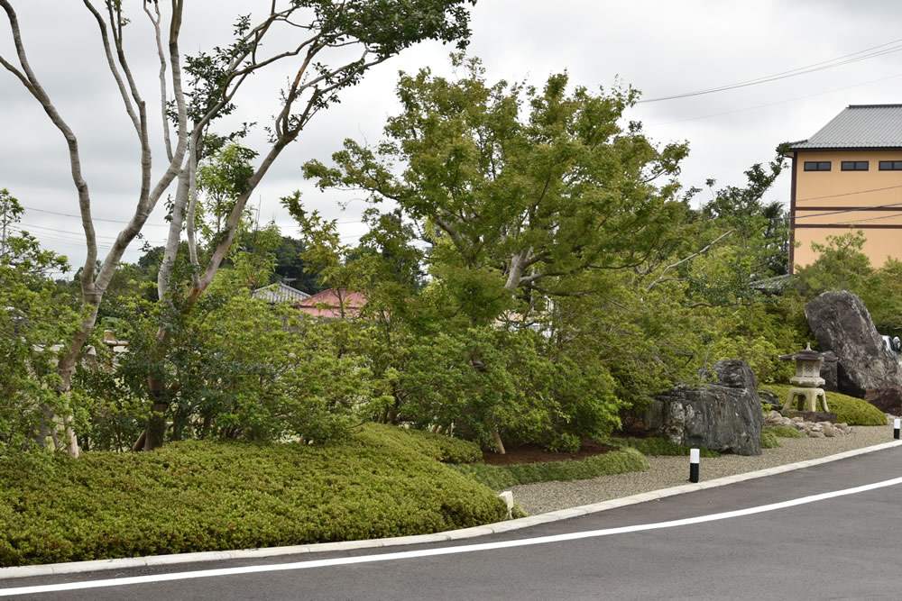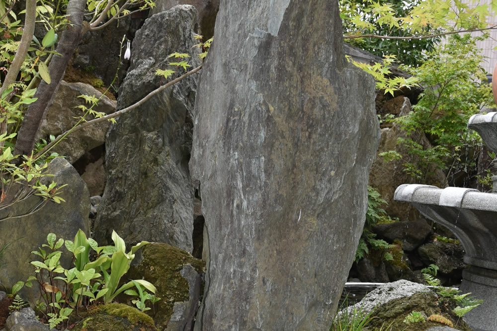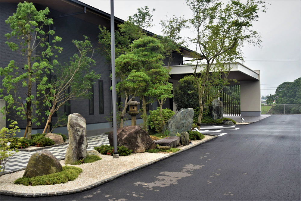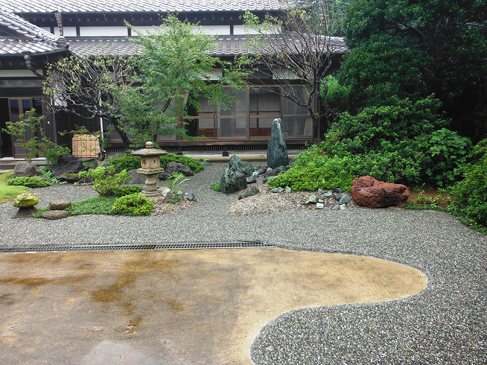 玄関左側に対して龍部は2石の紫石などによって龍の姿を見えるよう配置。背景に石を右流れに組、右側に向かって石組みにしました。植木と石組を空間に取り入れて一コマ、一コマを組み込み、灯篭などを配置し、来客者に歓迎の挨拶を踏まえて作品といたしました。