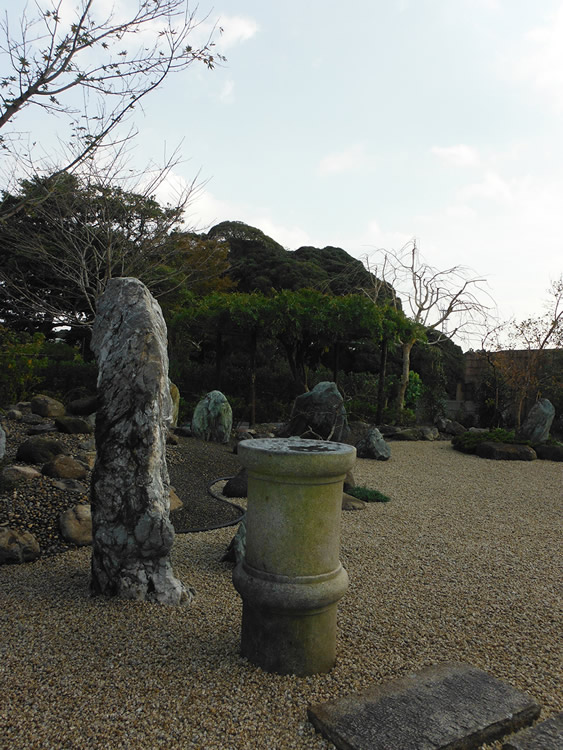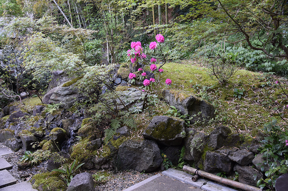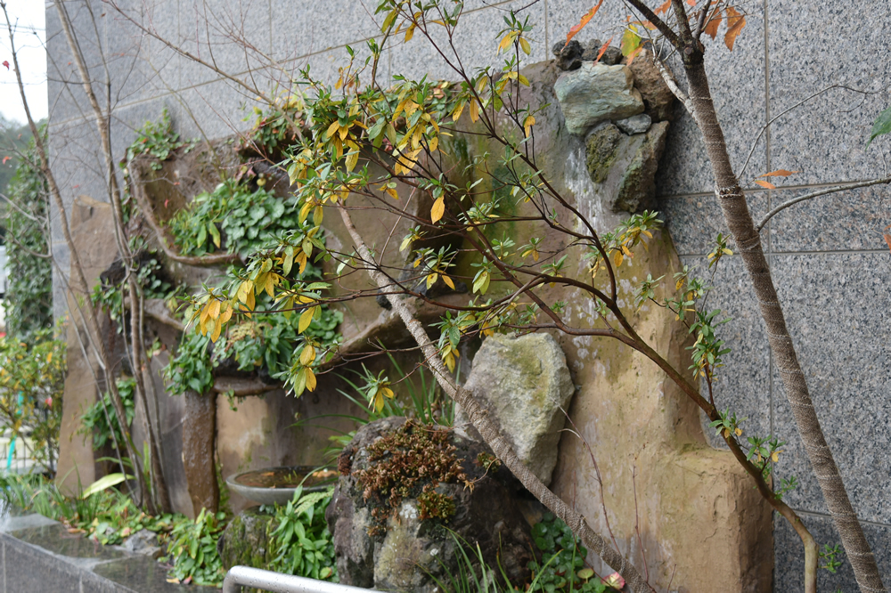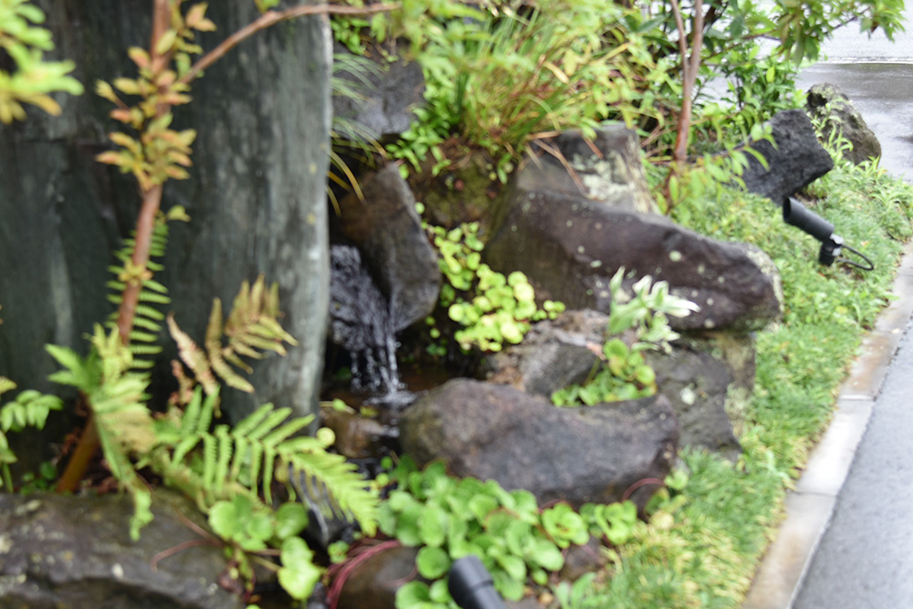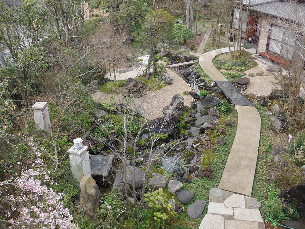 玄関前などは、石張りを通路とし、庭の入口と兼用し、滝水を左に見ながら石段を下る。