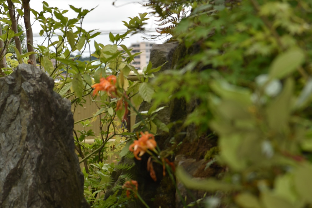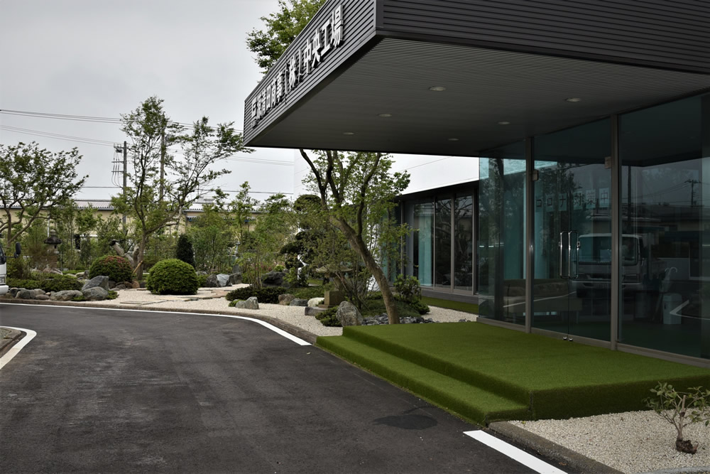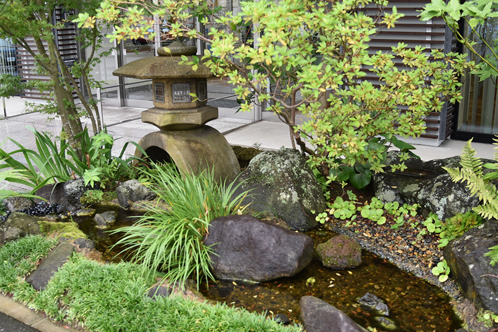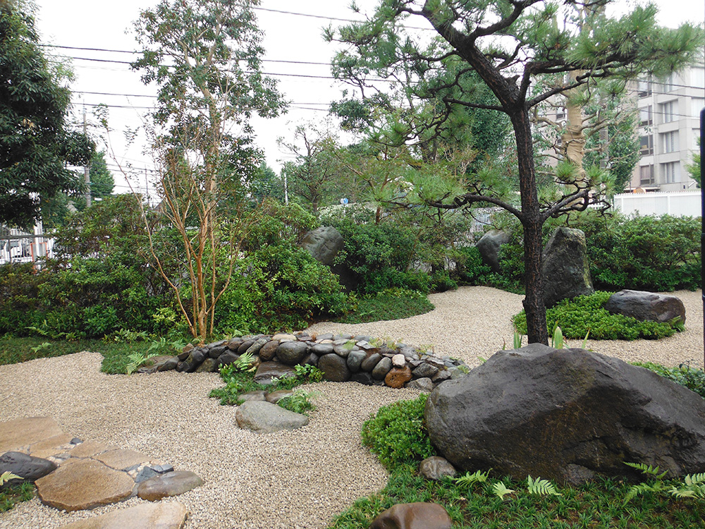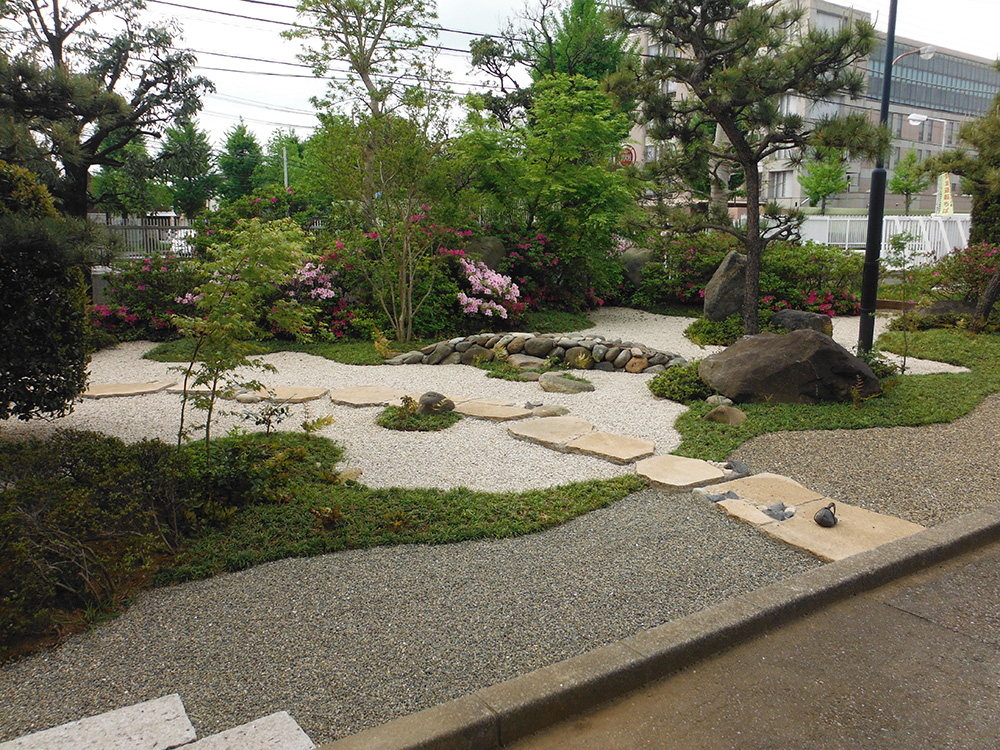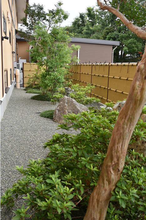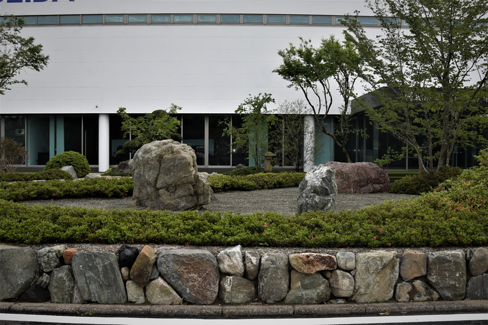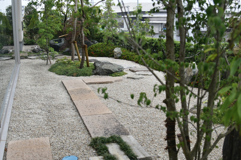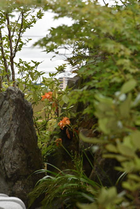 会社の庭。奥行き3メートル中に作庭しました。建築物は、地震対策によって震度6等の揺れに対応。