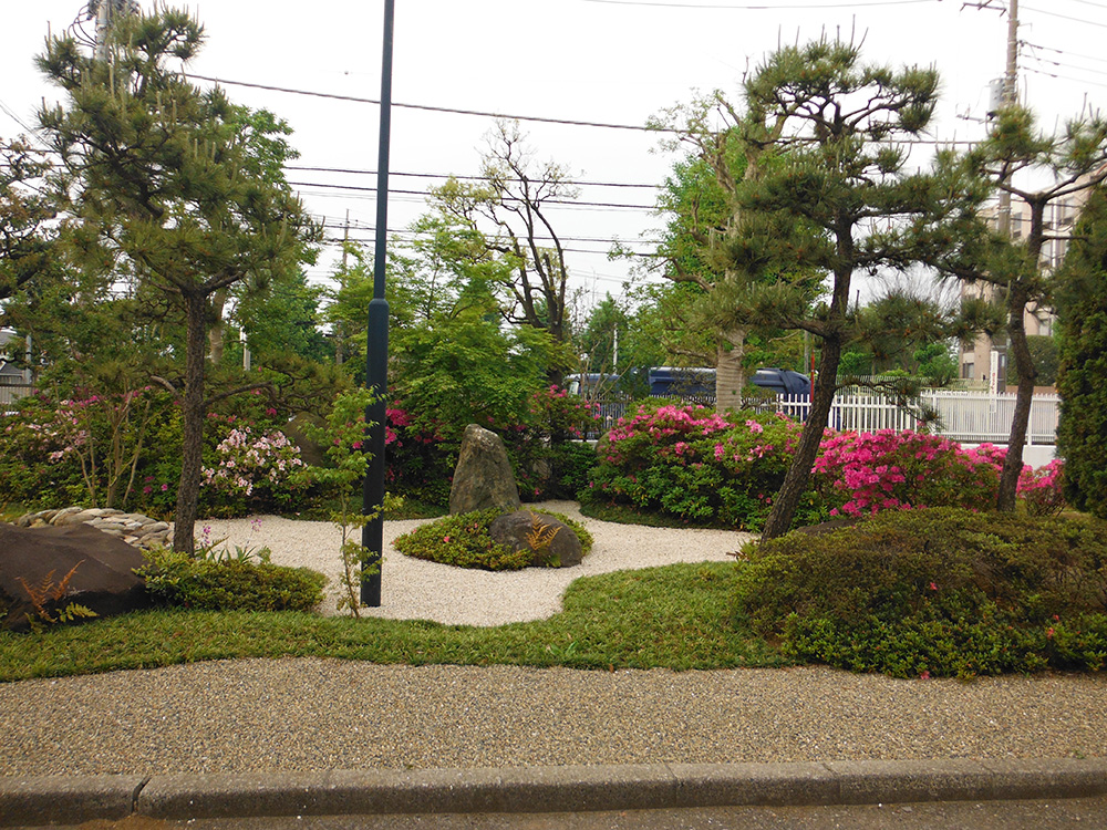 ⑦ 広い空間には、皐月、躑躅によっての刈込もようを造り間には、影石を配置し、小砂利によって静かな雰囲気をだしました。