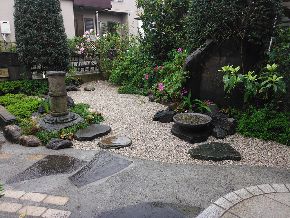 休日午後の一時。依頼様より、石庭、灯篭に対しては、高さが有る為できるだけ低く配置しました。