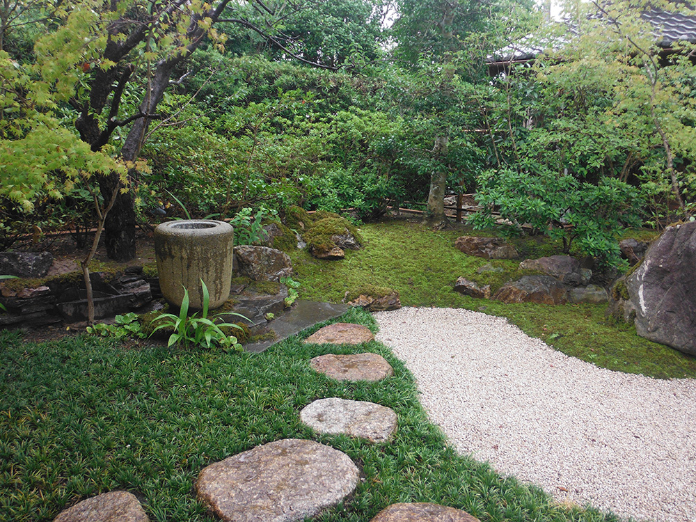門より玄関通路に飛石が配置され右左の風景につながりを大事に行っている庭のおとなしいさ、小砂利と低い苔山を組み込む事により園内美を取り入れ飛び石により庭に奥域を見る、又玉物を植え込みにより庭として安定性を計る。