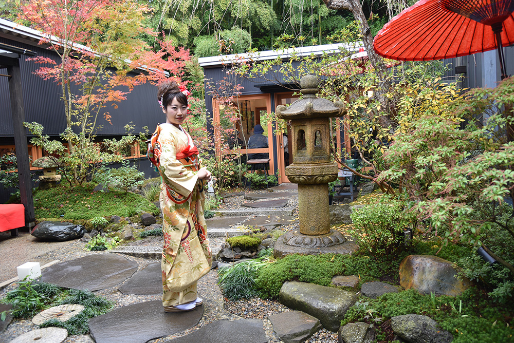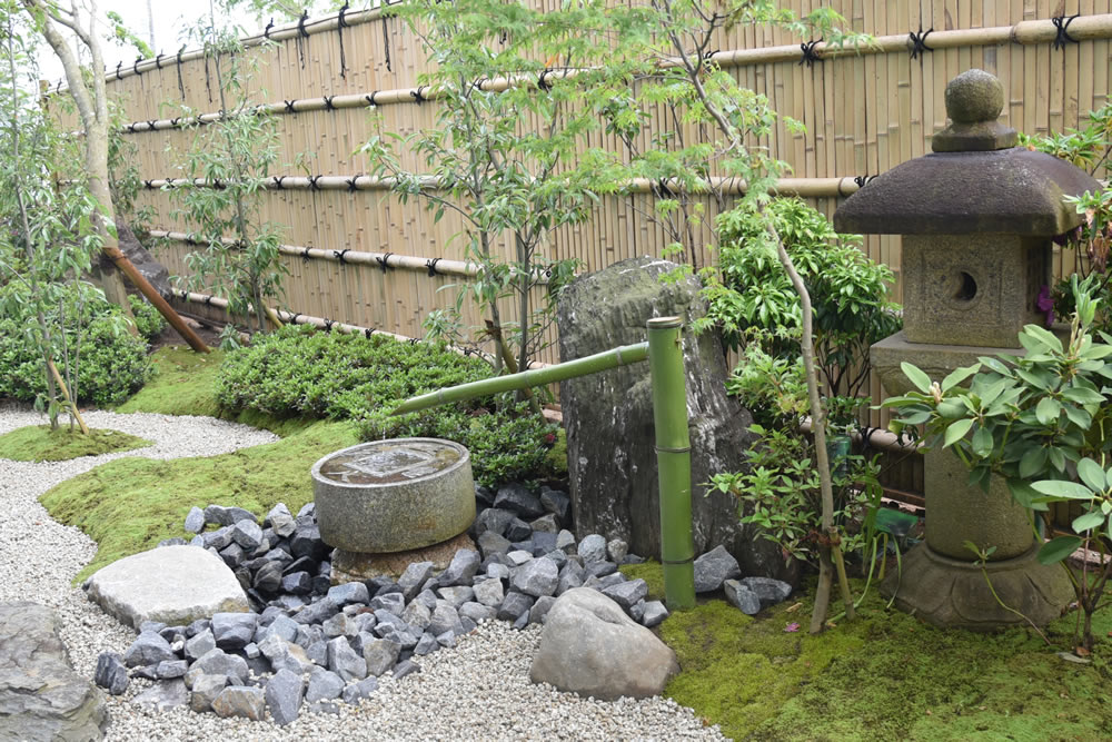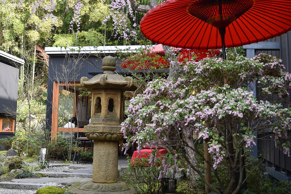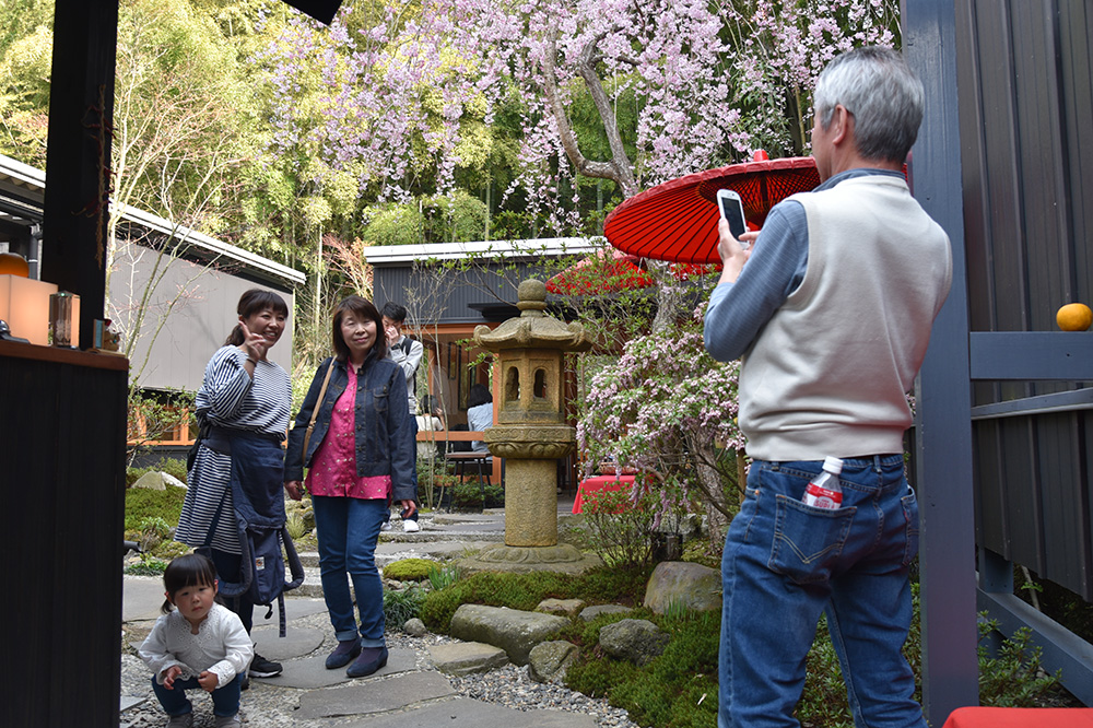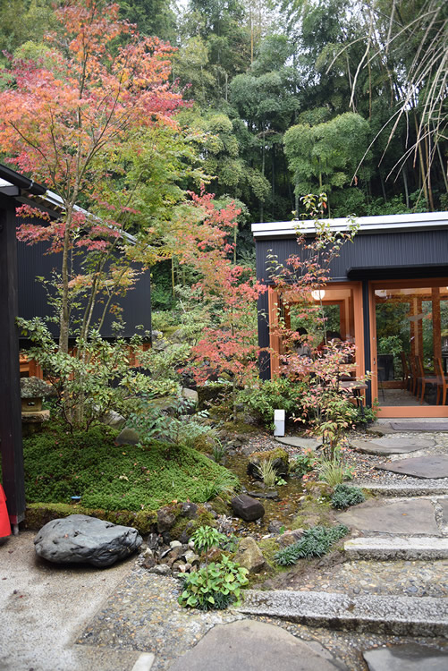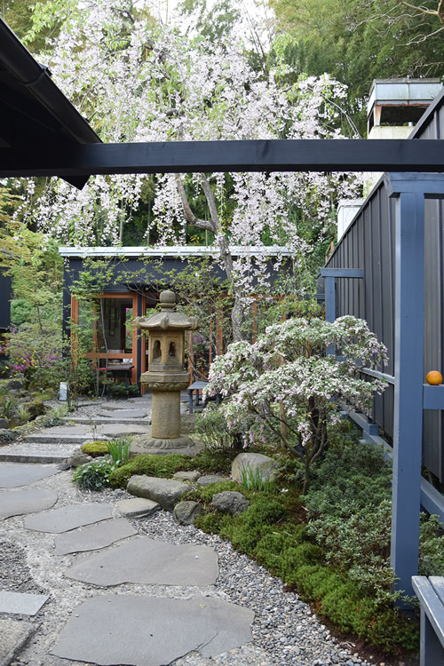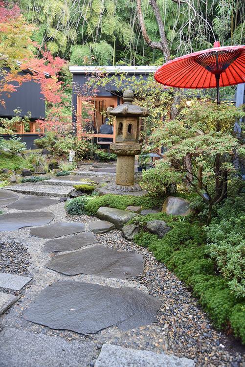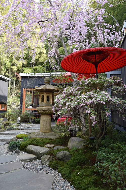 路地に入ると右に大明竹植え縁深い姿を表現し、主庭にはしだれ桜が植えてありましたので桜に対し、灯篭を置き、素傘などを組み合わせ庭の正面の姿を作り出しています。