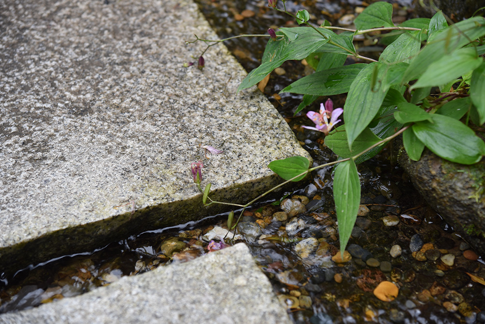 ④ 玄関左側には、小流(こながれ)が有るが玄関を歩きながら樹木の枝をすすかし見る水の流れを見ることが出来ます。
