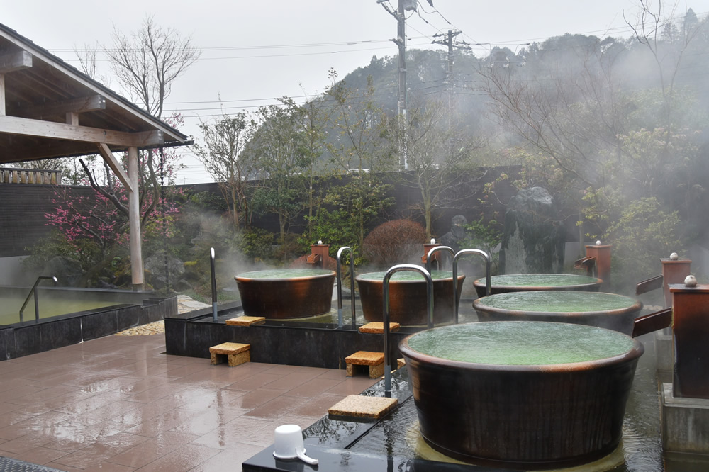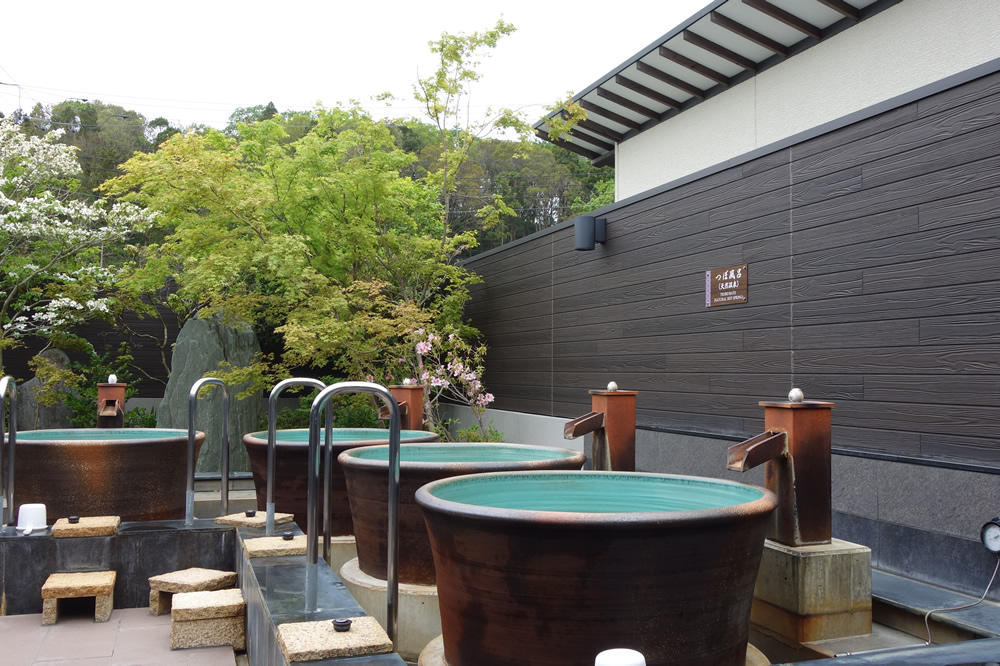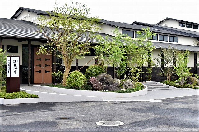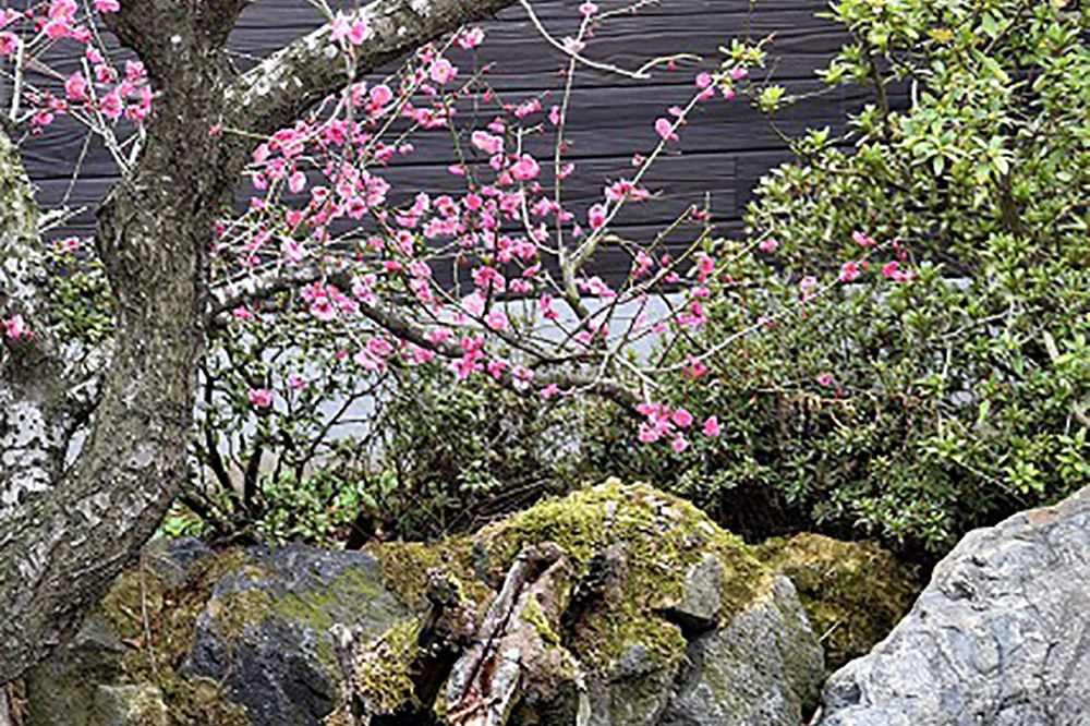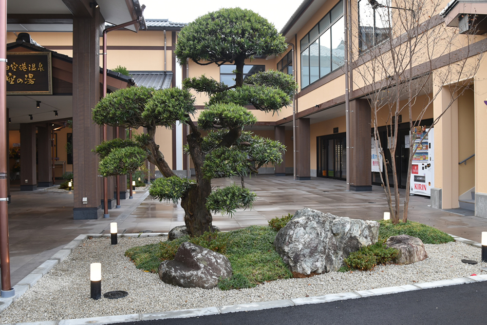 ⑥ 建築物の角部分には、紅白の梅を植え込み祝の庭園風呂の姿を表しています。