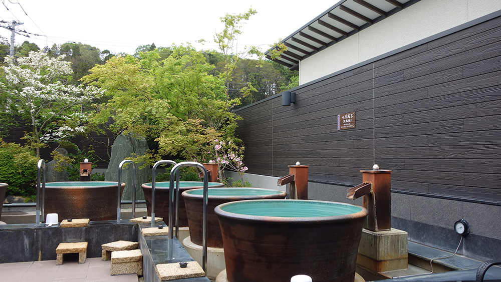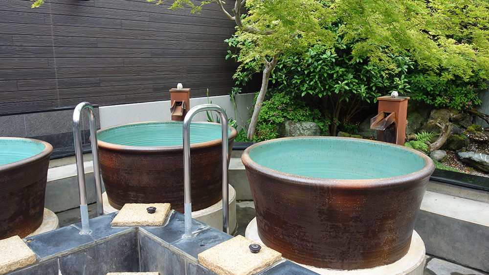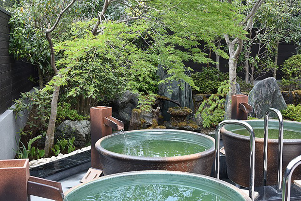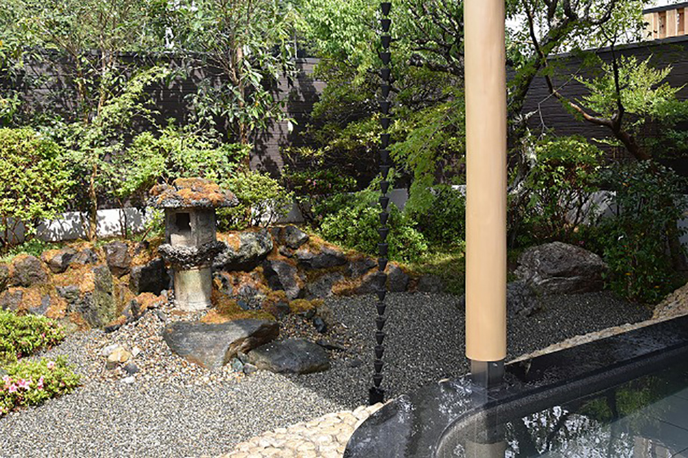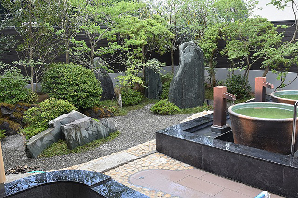 自然の山深い天然露天風呂に思えるように作庭にしました。庭園風景に力を入れない通常の庭の姿を表した。