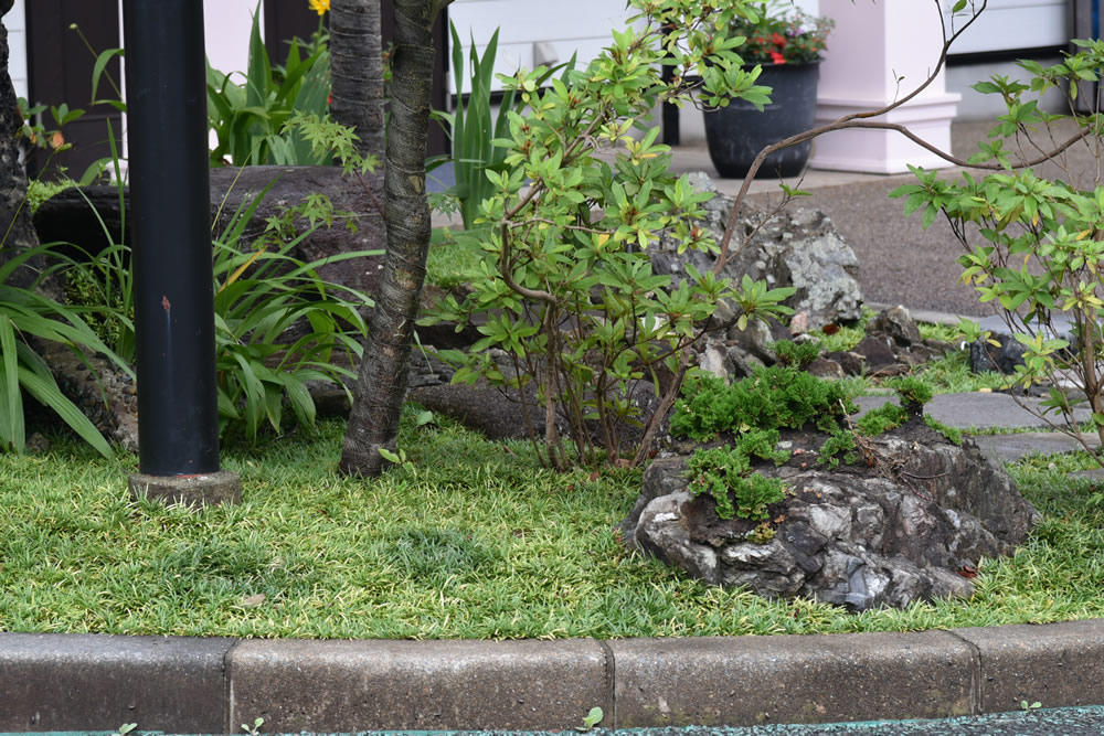 門より玄関の向いに低木等の植裁を行ったがその風景を造り変えることについて本社の置石、を使用によって庭を造り変えた姿・・・。