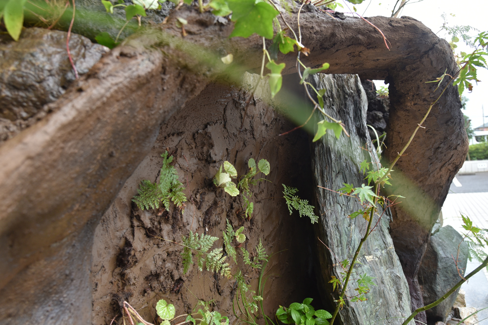 門、入口ついての壁面に苔・シダ類などを壁に植え付け、コンクリ-トを少しでも、緑深い姿を取り入れたと考えています。