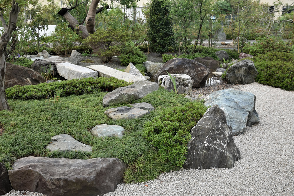 ② 道を歩いていると小さな地下に落ちる水の音、石組の隙間から流れである水の音、重量約3トン近い石を建て、高低差を造り出している。低木を多く使用し、小砂利、小石によって、水辺の世界を現している。