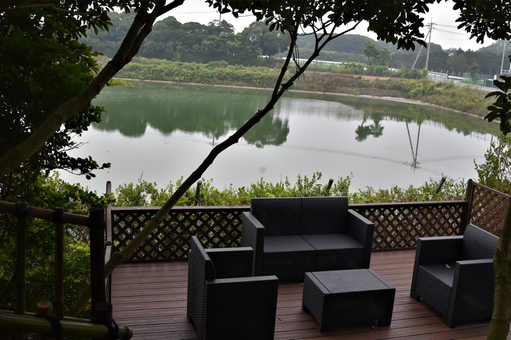 ホ-ルレストラン前側、道路を挟んで調整池があり遠景とのコントラスト。